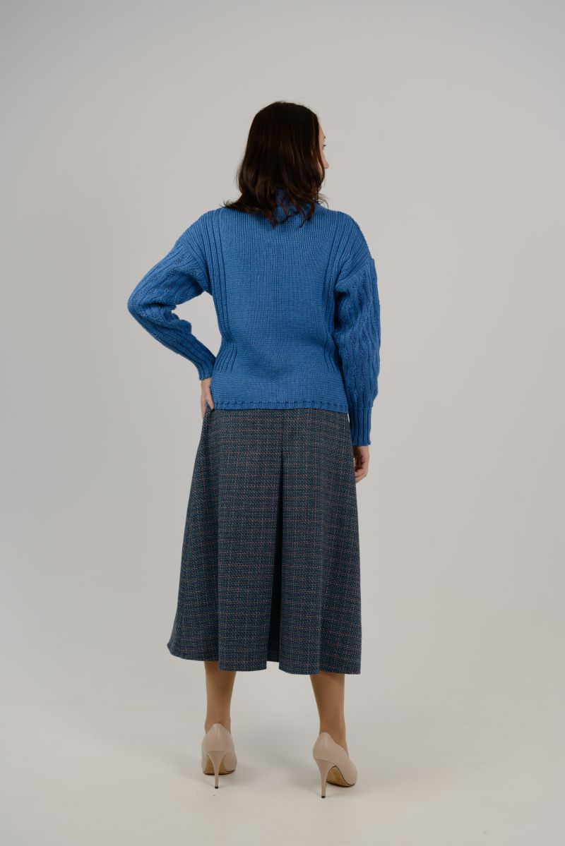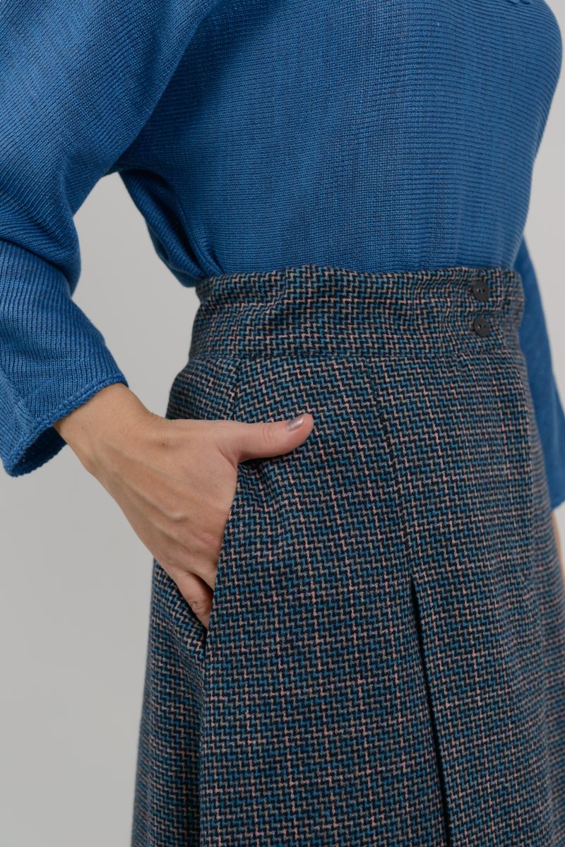 Описание: Юбка, в пояс по бокам вставлена резинка, молния, две пуговицы, боковые карманы, складки.