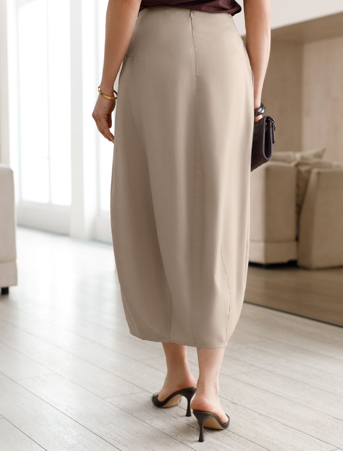 Юбка-тюльпан светло-бежевого цвета выполнена из плотного лиоцелла. Лиоцелл это более дорогой и экологичный вариант вискозы, очень прочный и шелковистый. Необычный акцентный крой юбки будет притягивать внимание окружающих. Форма тюльпана достигнута с помощью дополнительных вытачек и швов спереди и сзади. Приятным комфортным дополнением этой модели являются карманы в боковых швах. Разрез добавляет образу легкости и динамики. Юбка подойдет на большие размеры, на высокий рост будет длина миди, а низкий рост - длина макси. Такая юбка идеальна для создания современного образа от делового до кэжуал с акцентом на фактуру ткани и оригинальный силуэт.