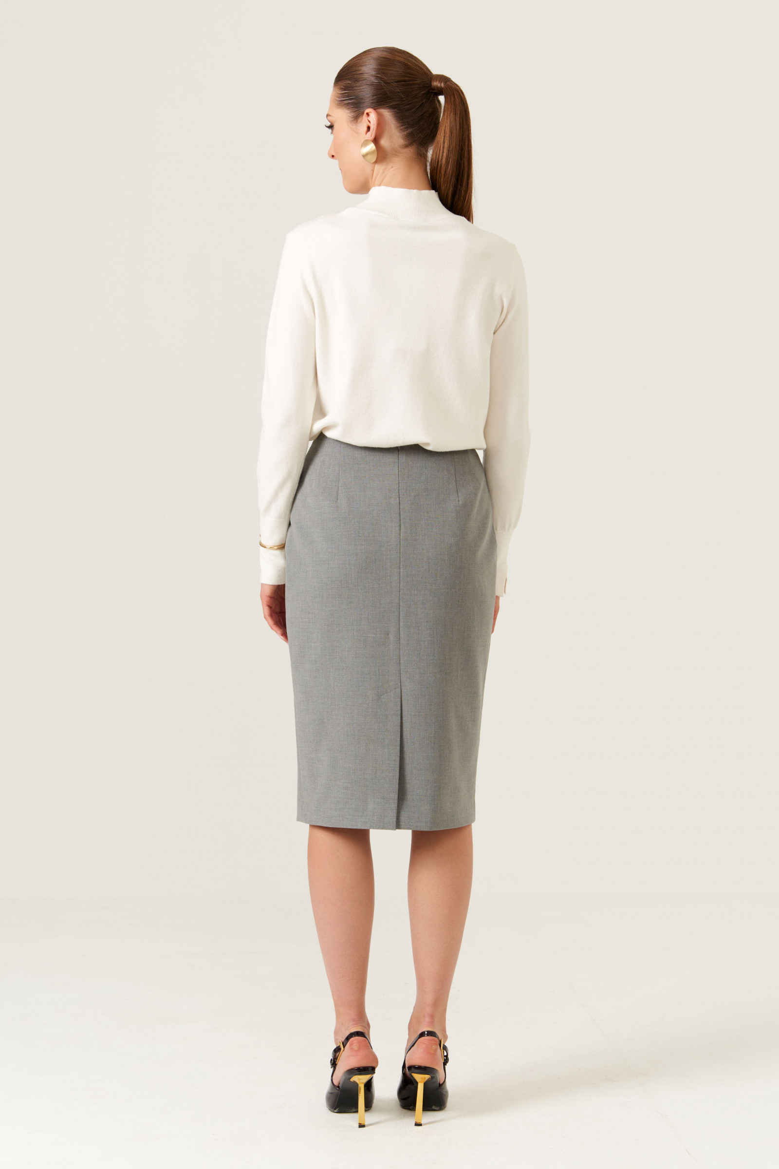 Женская юбка из смесовой ткани для повседневной носки. Полуприлегающий силуэт обеспечивает комфорт и стильный внешний вид. Верхний срез юбки обработан обтачкой, что придает изделию аккуратный и завершенный вид. Заднее полотнище имеет четыре талиевые вытачки для лучшей посадки и формы, а также располагается средний шов с потайной застежкой-молнией обеспечивает удобство при надевании и снятии юбки. На заднем полотнище в среднем шве расположен разрез-шлица, добавляющий свободу движений и стильный акцент. Юбка выполнена на подкладке, что обеспечивает комфорт при носке. Цвет — серый, универсальный и легко сочетаемый с различными топами и обувью.