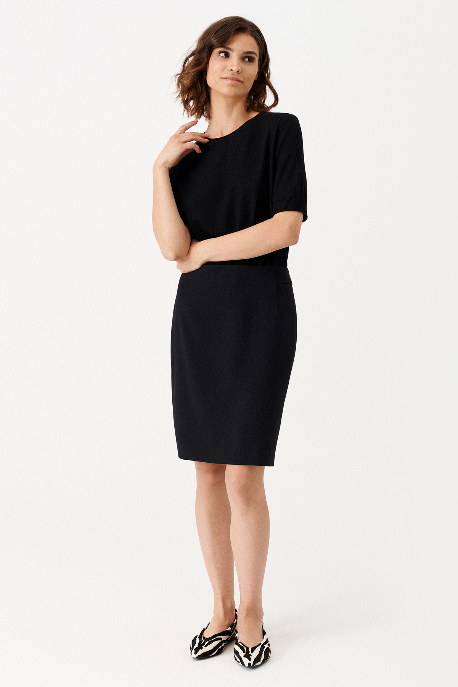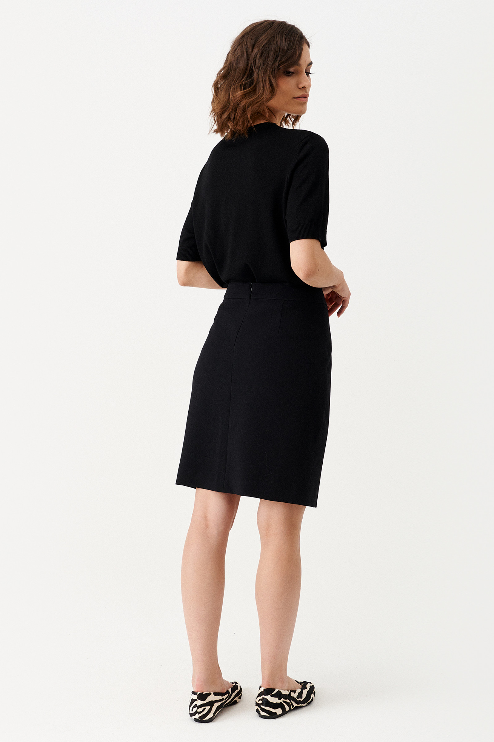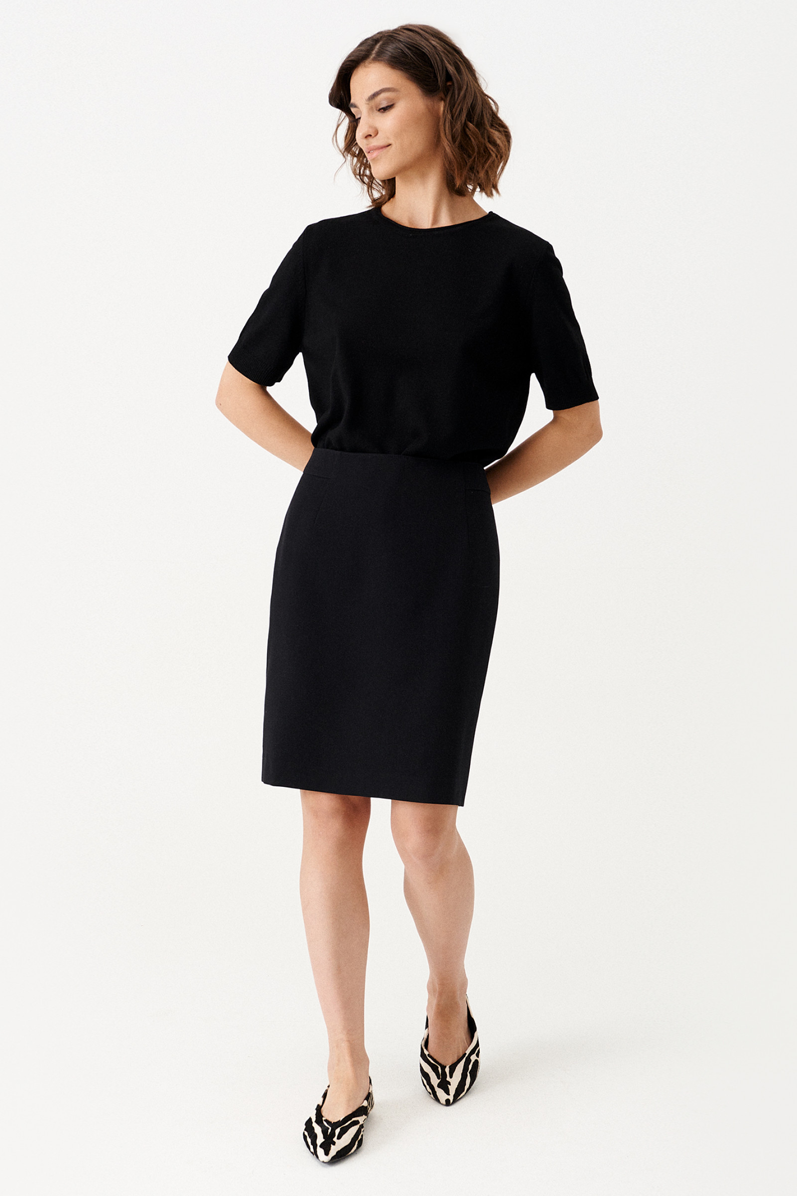 Юбка женская из костюмной ткани с добавлением вискозы. Юбка подходит для повседневной носки. Юбка приталенного силуэта длиной до колена. Застегивается на потайную молнию в среднем шве на задней части юбки.