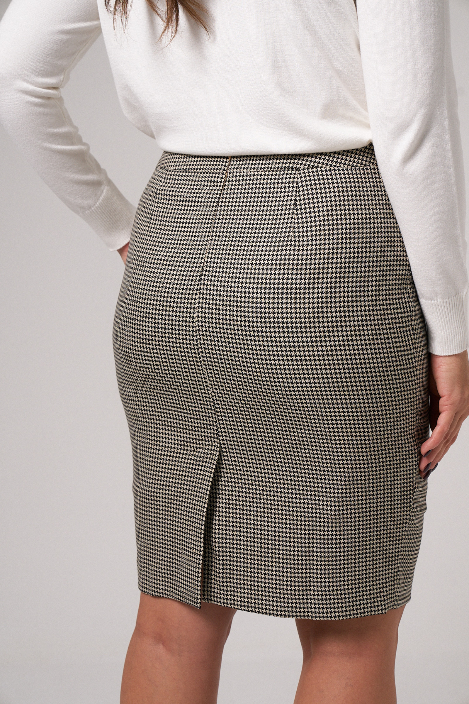 Юбка женская из костюмной ткани для повседневной носки. Юбка прилегающего силуэта длиной до колена. Верх пояса обрабртан отрезным поясом-обтачкой. Застегивается на потайную молнию в среднем шве на задней части юбки. Юбка на поливискозной подкладке. Средний шов на задней части юбки заканчивается шлицей.