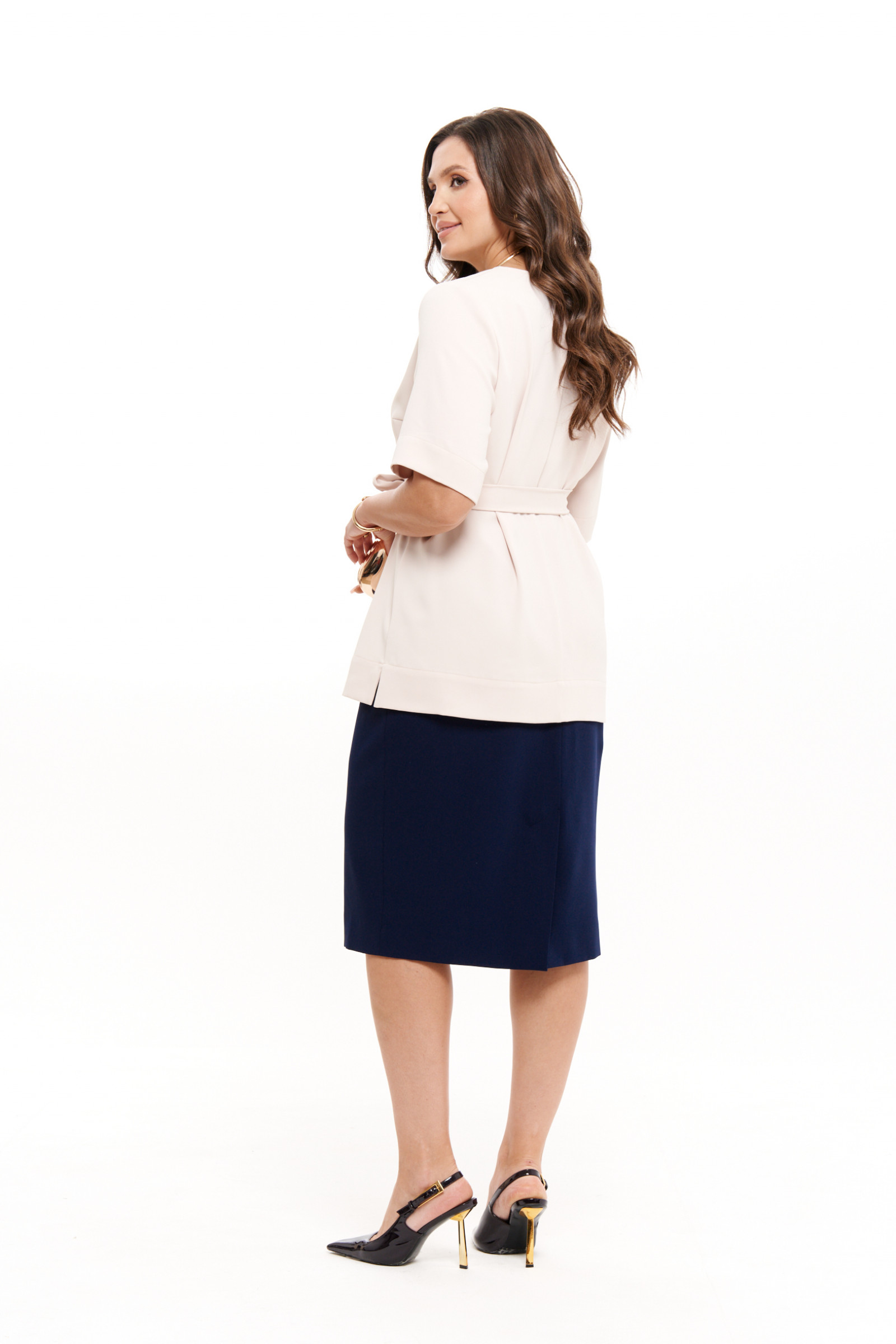Юбка женская из струящейся ткани — это идеальное сочетание стиля и комфорта для повседневной носки. Модель выполнена в классическом крое: прямая, с элегантной посадкой чуть ниже колена. Верх юбки обработан притачным поясом с удобной резинкой в боковой и задней части, что обеспечивает комфортную посадку на талии. Застёжка представлена одной обмётанной петлёй и пуговицей, а также потайной молнией в среднем шве. Передняя часть украшена двумя вытачками, подчёркивающими фигуру, а в задней части — шлица, обеспечивающая свободу движений. Подкладка из поливискозы добавляет комфорт, делая юбку приятной к телу даже в тёплое время года.
