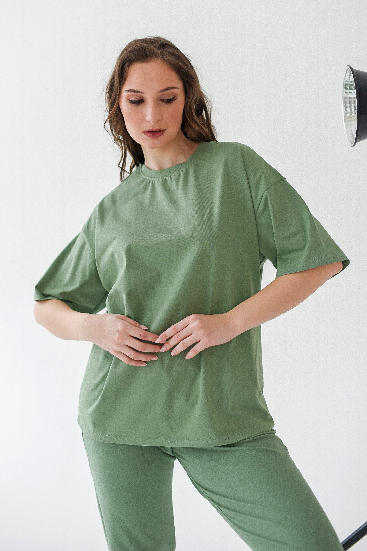 Футболка женская свободной формы, из гладкокрашенного трикотажного х/б полотна с лайкрой, в стиле «Oversize». Круглая горловина. Спущенную линию плеча, продолжает втачной рукав, до линии локтя.
