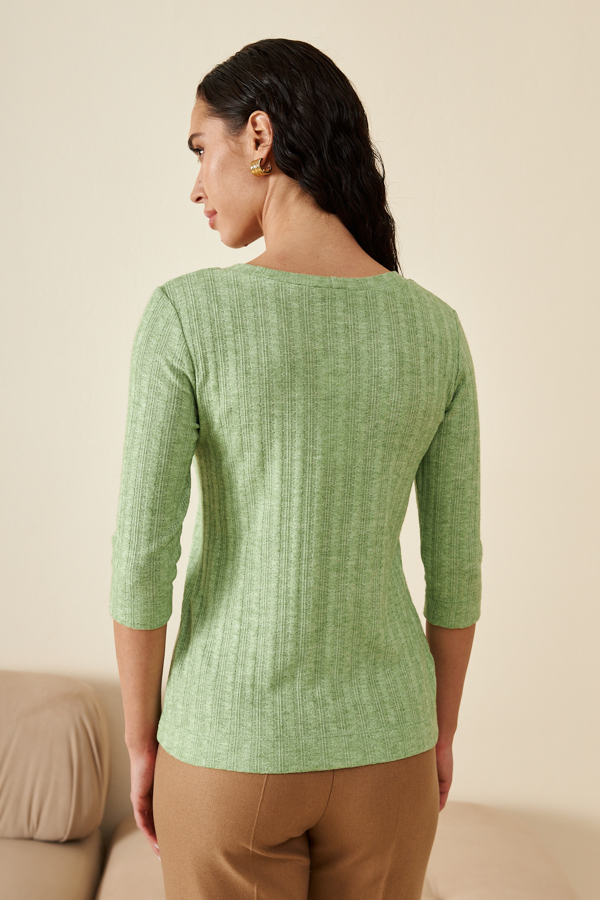 Джемпер прилегающего силуэта из фактурного эластичного полотна. Втачной рукав 3/4. Круглый вырез горловины оформлен бейкой.