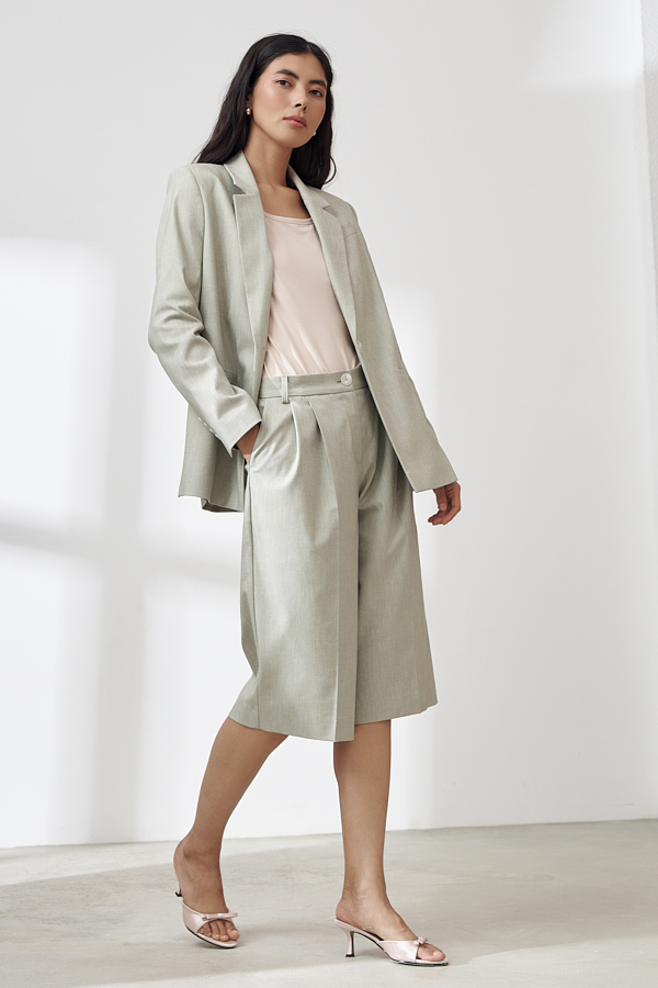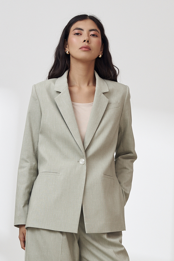 Жакет прямого силуэта с разрезами в боковых швах из меланжевой костюмной ткани. Изделие с английским воротником и застежкой на пуговицу. На передней части жакета выполнен нагрудный карман с листочкой и карманы в рамку. Втачной длинный рукав, снизу шлица с пуговицами. Изделие идеально держит форму, имеет четкую линию плеча благодаря плечевым накладкам. Жакет на подкладке.