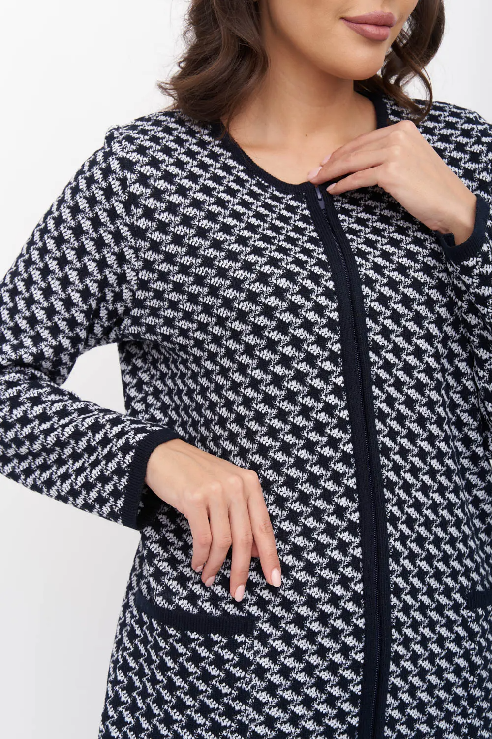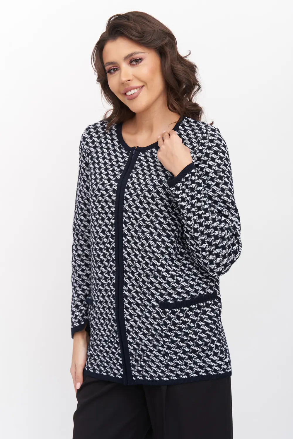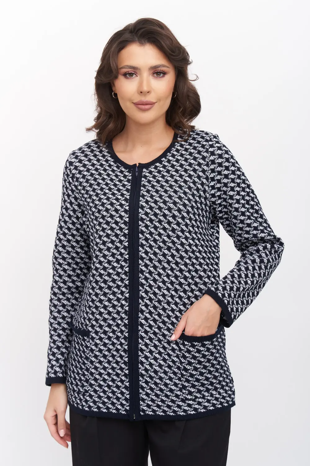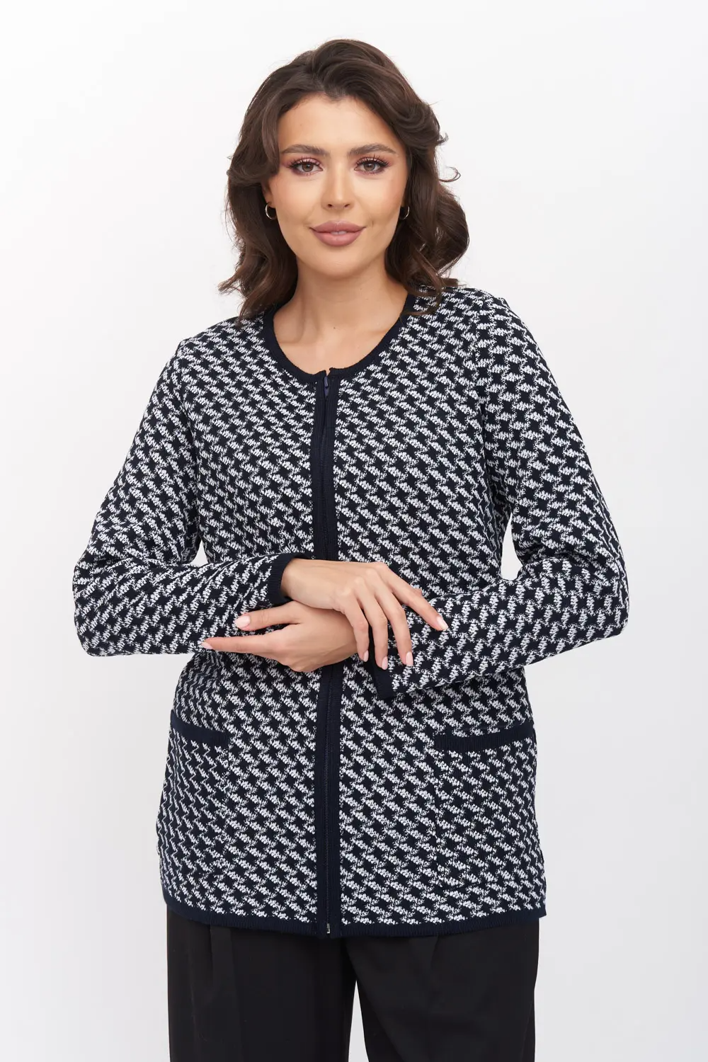 Женский вязаный жакет полуприлегающего силуэта. По переду застегивается на молнию, вырез горловины круглый. Рукава втачные длинные. Два накладных кармана квадратной формы. Жакет выполнен жаккардовым переплетение образуя неброский рисунок. синий