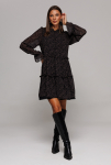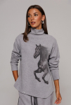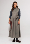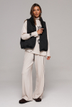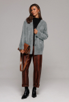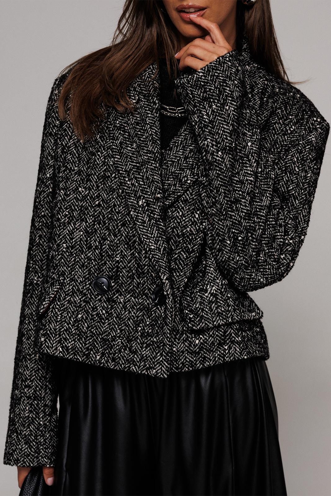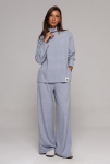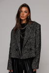 Жакет укороченный прямого силуэта, двубортный с втачным двухшовным рукавом. Полочка с застежкой на петлю-пуговицу и имитацией кармана с клапаном и отрезным бочком. Спинка с отрезным бочком и центральным швом. Воротник пиджачного типа с отрезной стойкой. Жакет на подкладке. 80% ПЭ, 20% шерсть