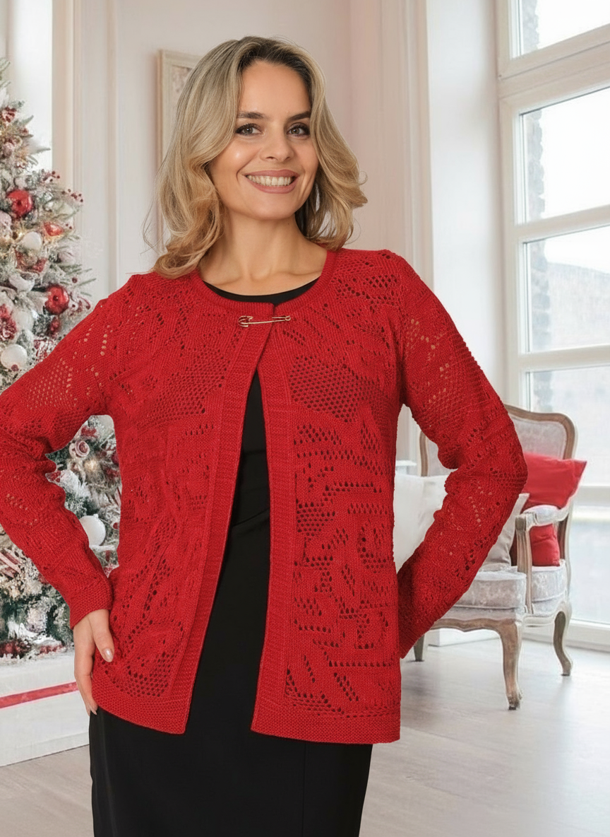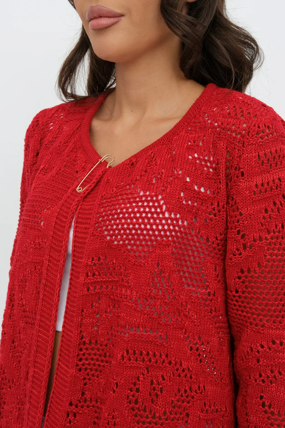 Нарядный женский вязаный жакет с брошью. Этот элегантный жакет должен быть в гардеробе любой модницы. Модель прямого силуэта, что делает его идеальным выбором для женщин, предпочитающих стильную и комфортную одежду. Жакет выполнен красивым ажурным узором. Состав изделия включает в себя 50% хлопка, что придаст комфорт в носке в любое время года.  Модель отлично подойдет к платью, юбке и брюкам. Составит нежный и романтичный образ каждой дамы.