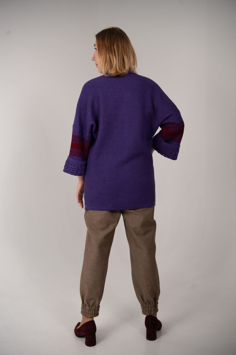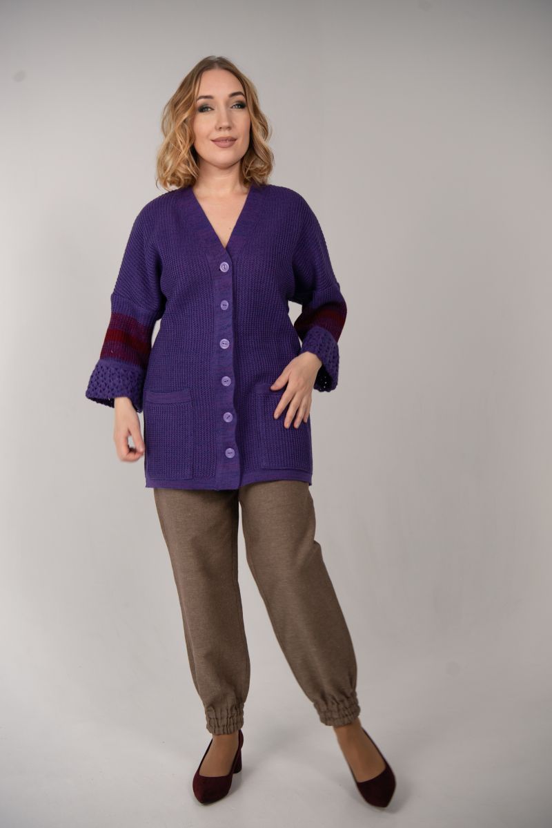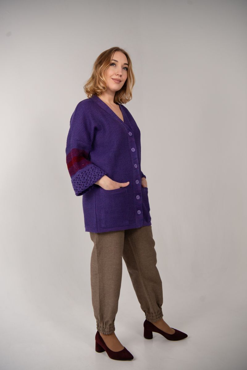 Описание: Жакет с карманами, застежка на планке с пуговицами, отделка крючок, трикотаж.