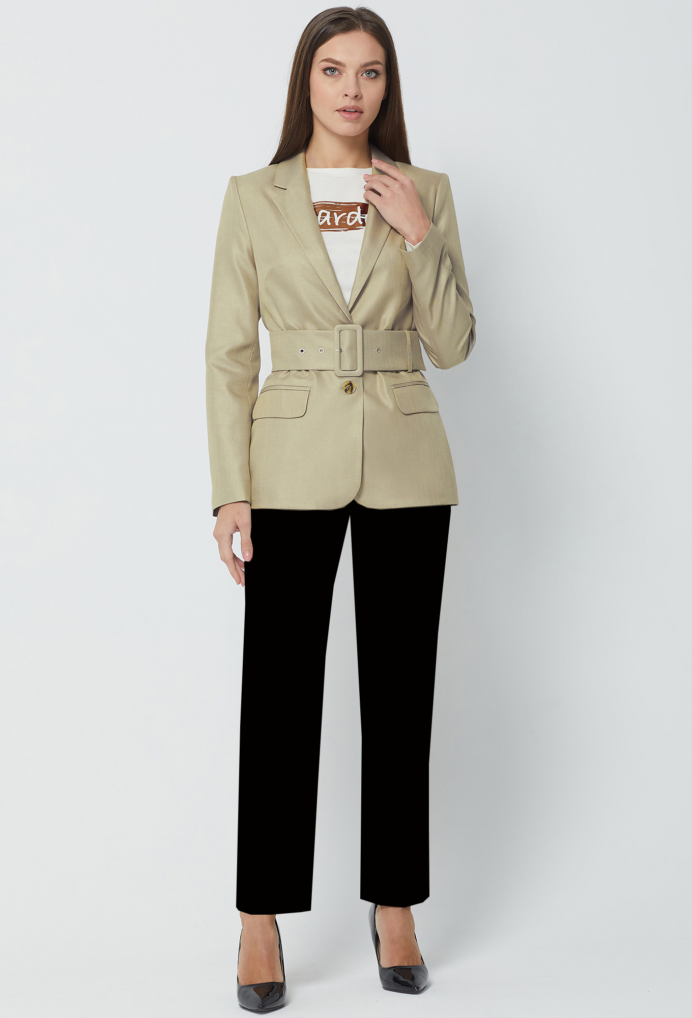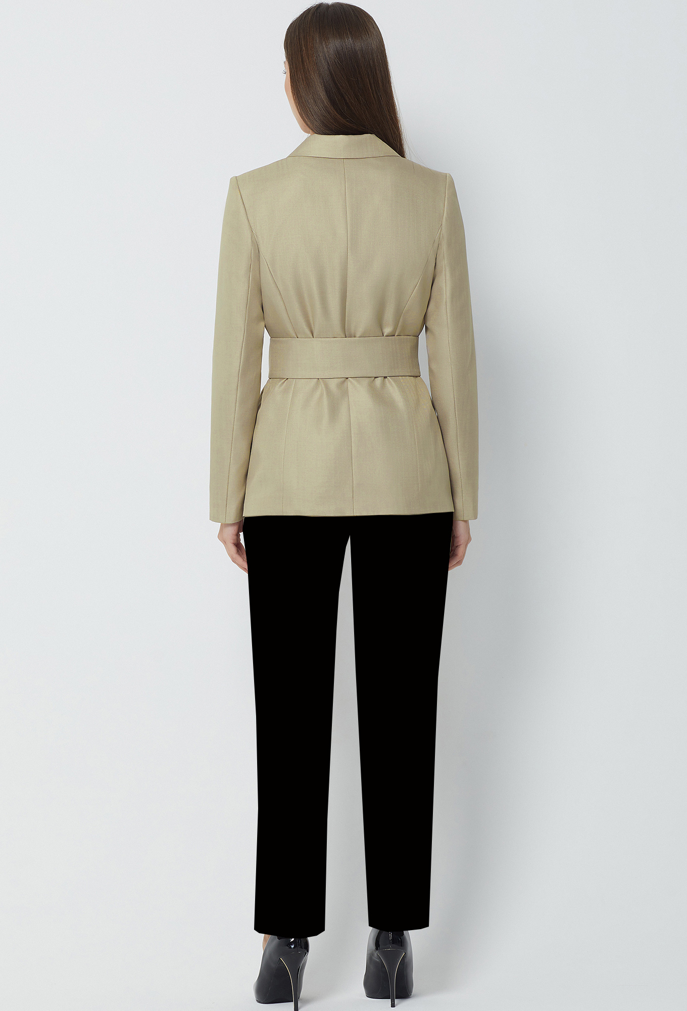 Жакет полуприлегающего силуэта с центрально-бортовой застёжкой на две петли-пуговицы. Перед с горизонтальными параллельными клапанами и рамками. Рукава втачные двухшовные. Воротник отложной с лацканами. На подкладке. Дополняется широким поясом с пряжкой из основной ткани. Ткань - "хамелеон", в зависимости от освещения может менять свой цвет от светло-бежевого до песочного. Это нужно видеть, на фото не передать.
