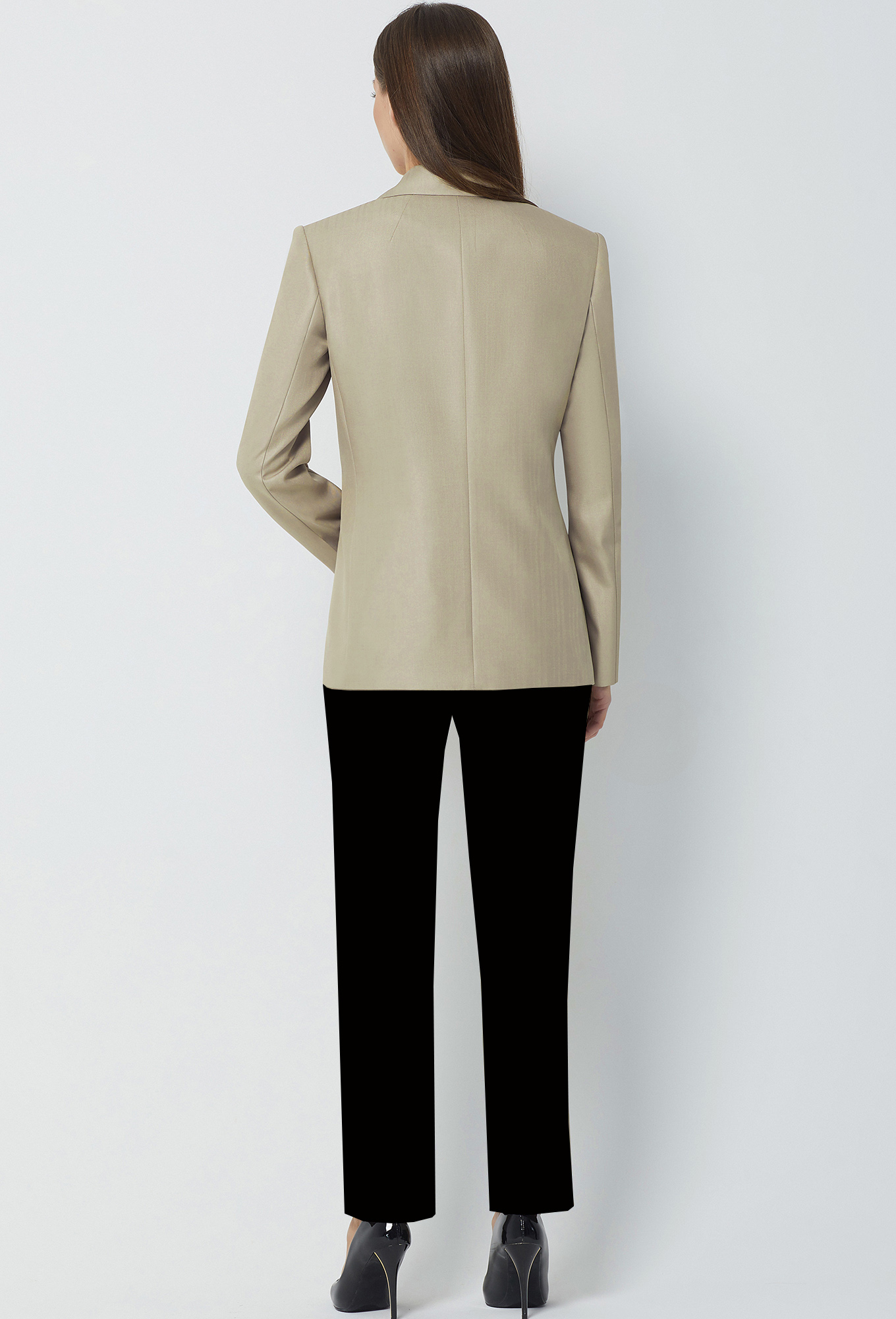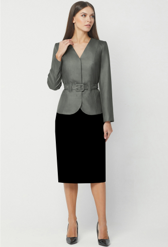 Жакет полуприлегающего силуэта с центрально-бортовой застёжкой на одну петлю и пуговицу. Перед с прорезными карманами с клапанами и рамками. Рукава втачные двухшовные, со шлицами с отделочными пуговицами. Воротник отложной с широкими лацканами, изделие на подкладке.