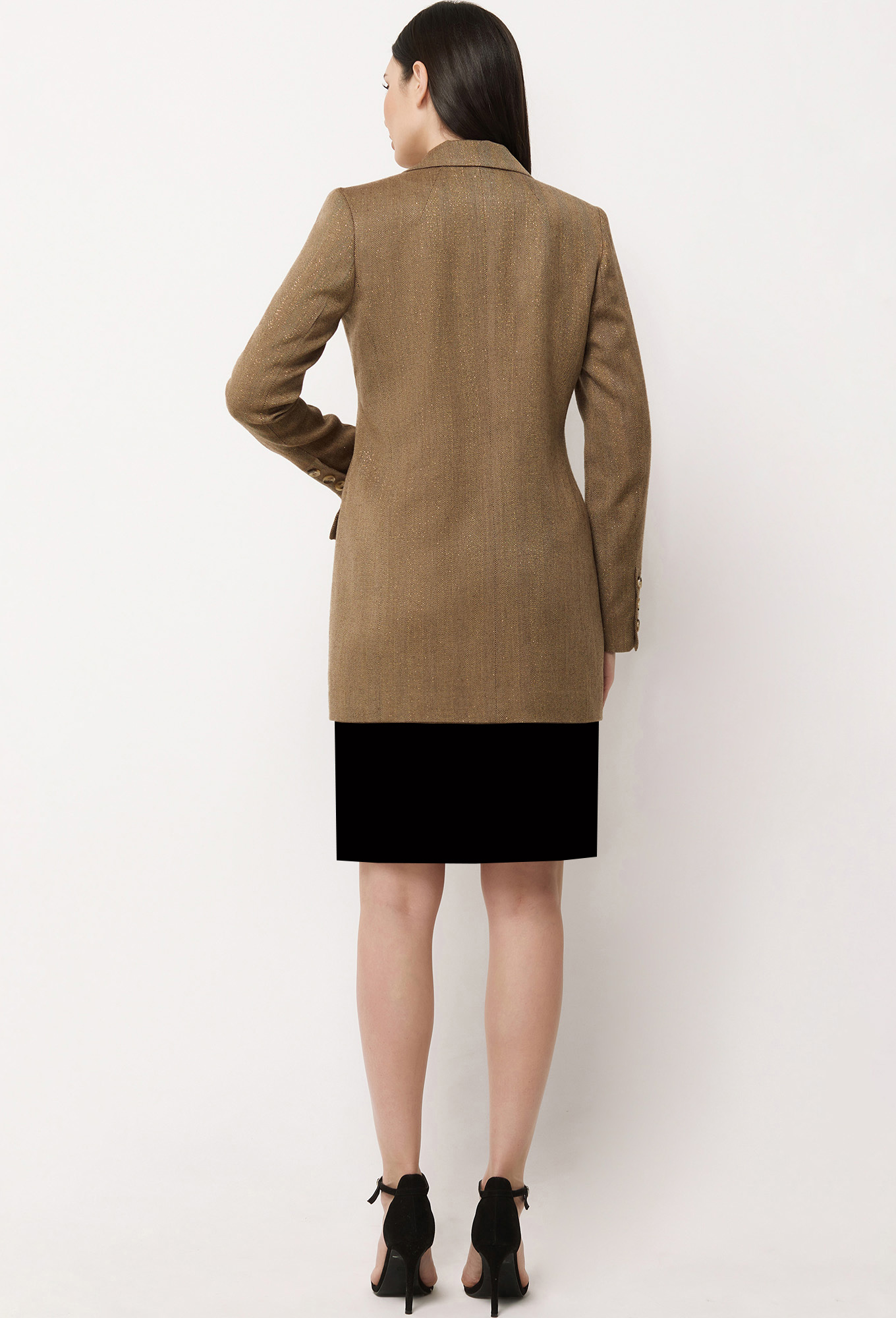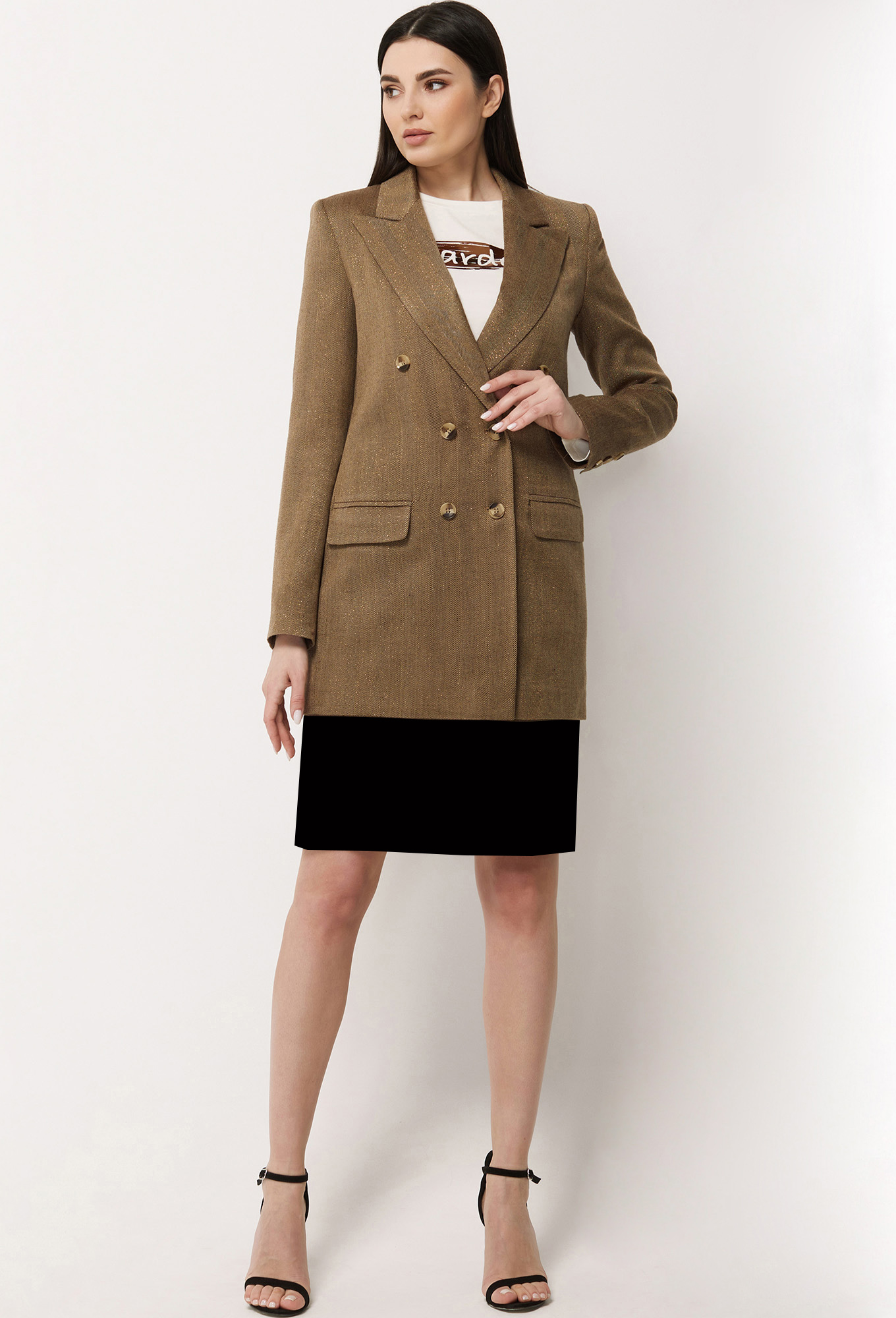 Удлинённый двубортный жакет прямого силуэта с застёжкой на петли, пуговицы и бочком, выполнена из ткани гусиная лапка. Перед с горизонтальными карманами с рамками и клапанами. Спинка со средним швом. Рукава втачные двухшовные со шлицами и декоративными пуговицами. Воротник отложной с лацканами. Жакет на подкладке с плечевыми накладками.