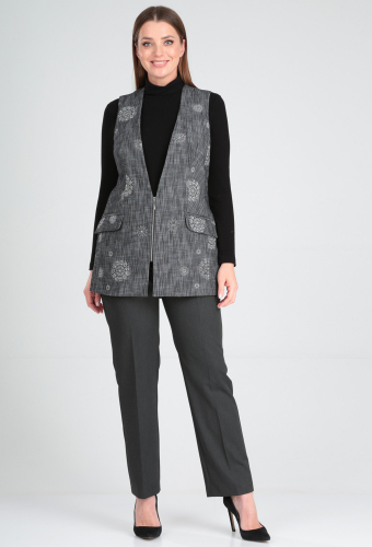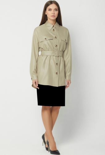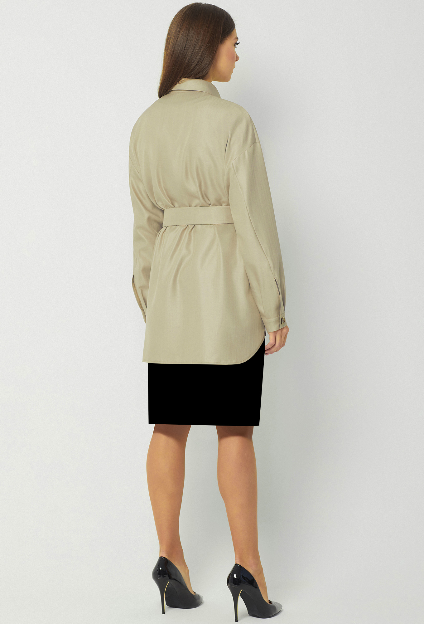 Жакет свободного кроя, со спущенной линией плеча и разным уровнем низа переда и спинки. Перед с центральной застежкой на петли и пуговицы и двумя накладными карманами с клапанами и декоративными пуговицами. Рукава рубашечного типа с манжетами и застёжкой на петли-пуговицы. Воротник отложной с отрезной стойкой. Дополняется поясом с пряжкой из основной ткани.