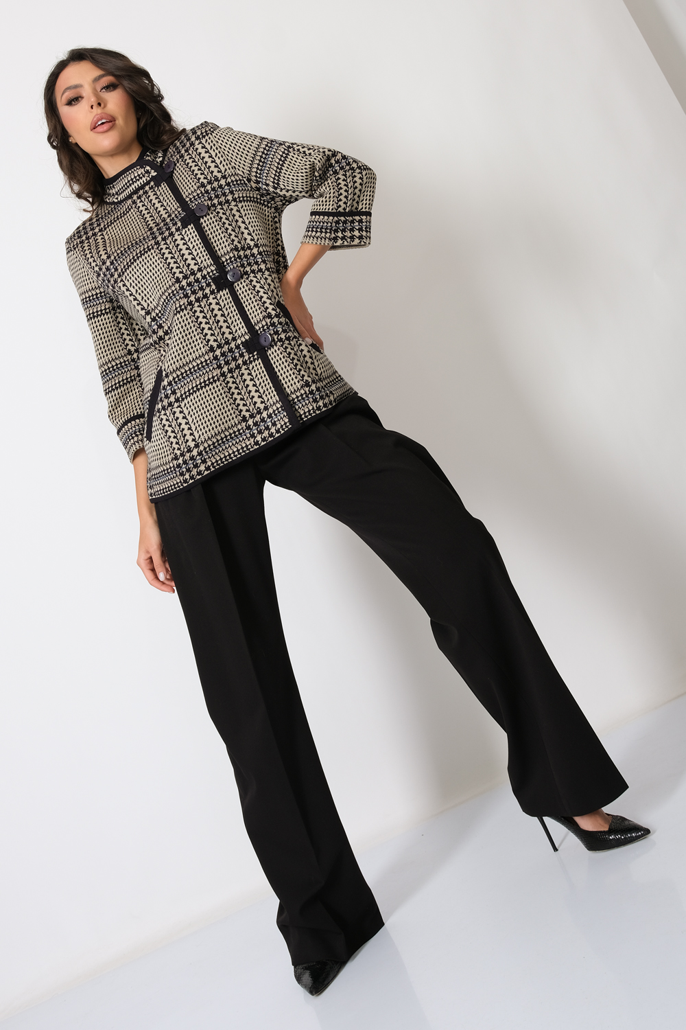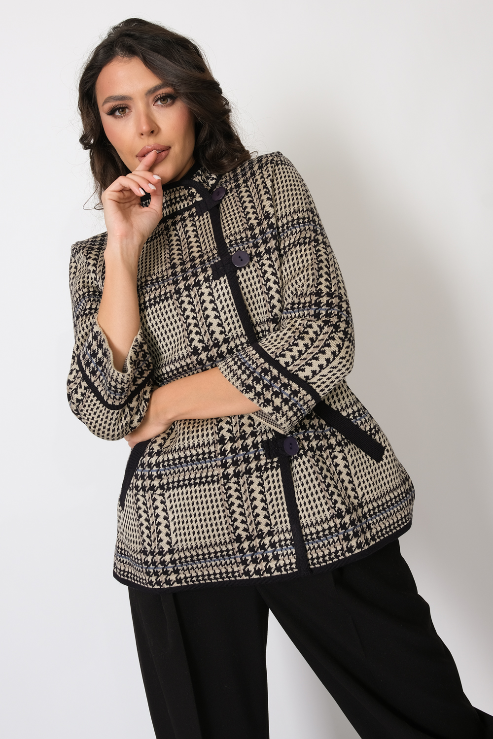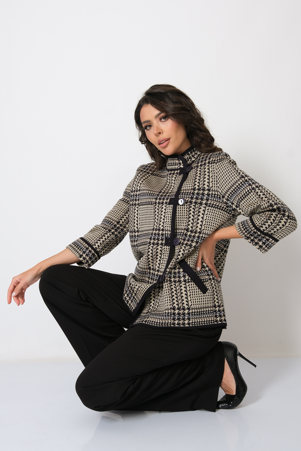 Жакет женский полуприлегающего силуэта с воротником стойкой. Рукава втачные длинные.  Два прорезных кармана. Жакет застегивается на пуговицы и навесные петли. Изделие выполнено жаккардовым рисунком, образующим клетку.  По отвороту на рукавах, низу изделия, краю воротника и полочке проходит отделка в контрастном цвете. бежево-синий