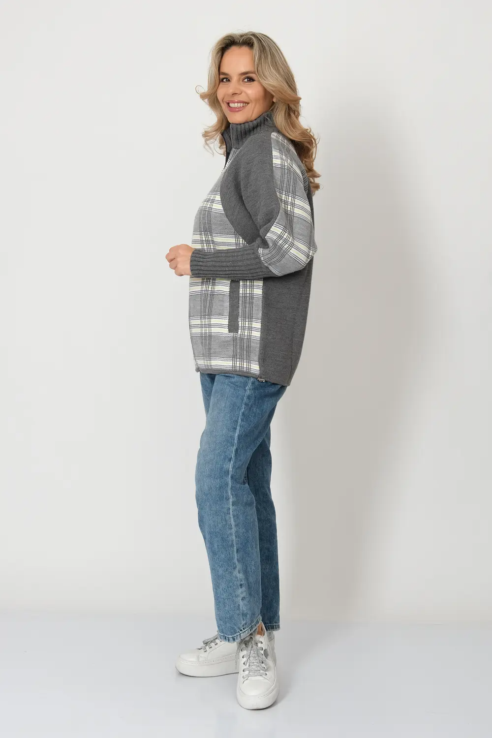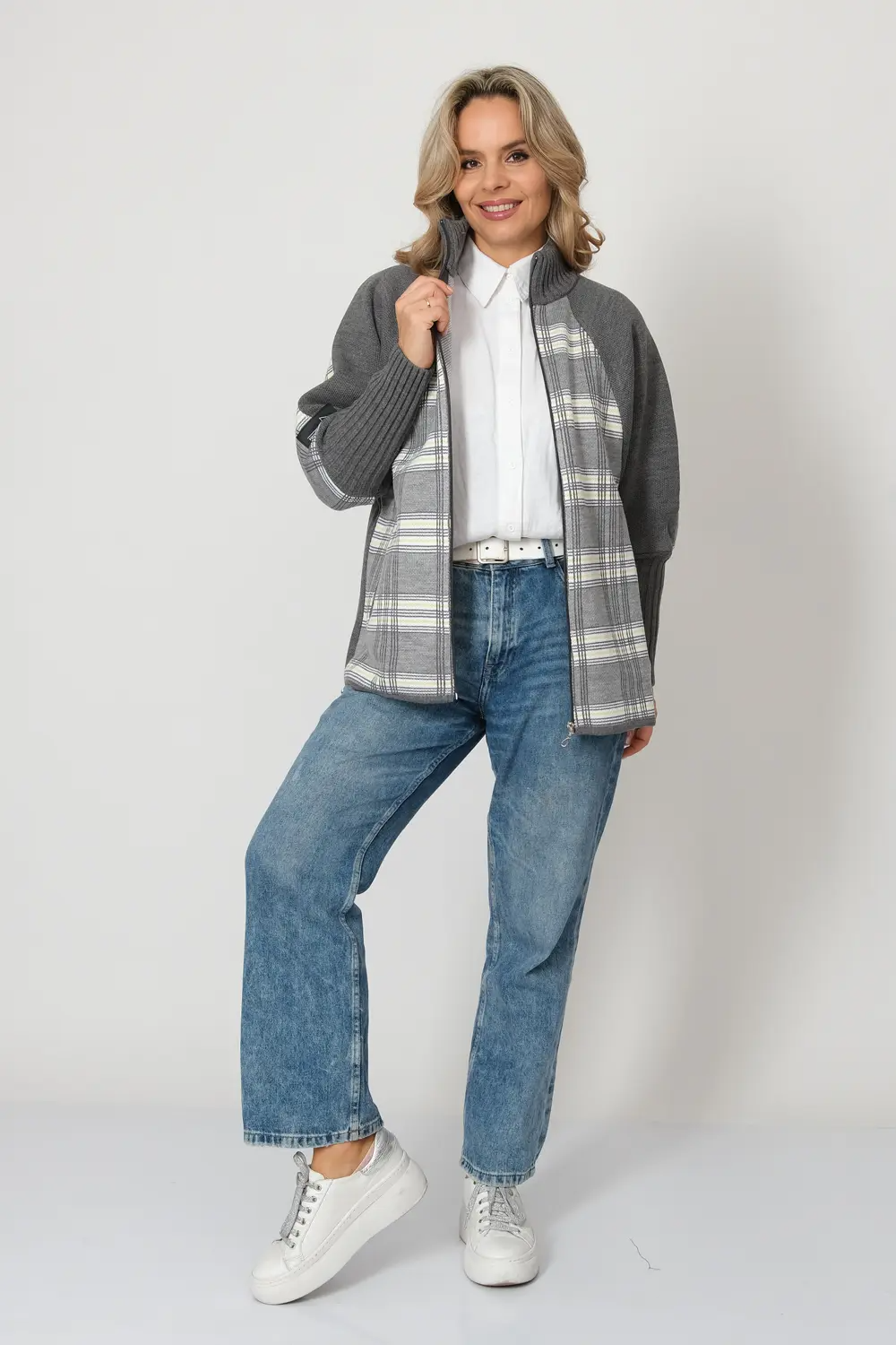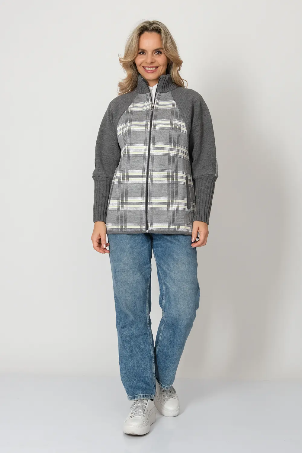 Жакет женский на молнии прямого силуэта в спортивном стиле, на молнии. Воротник-стойка, рукав-реглан  с эластичным манжетом.  По бокам вязанного жакета два прорезных кармана.  Жакет выполнен жаккардовым переплетением с комбинацией однотонного полотна  и  рисунком в клетку.