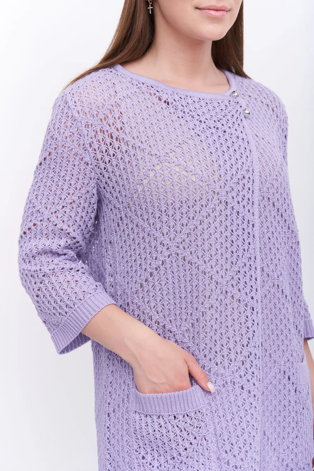 Ажурный вязаный жакет свободного силуэта с запахом. Застёгивается на декоративную брошку. Рукава втачные длиной 7/8. Модель имеет накладные карманы, что определяет практичность и удобство данной вещи.