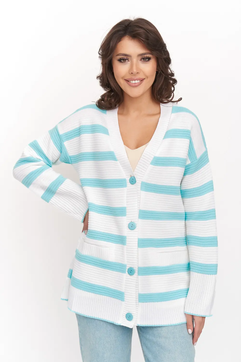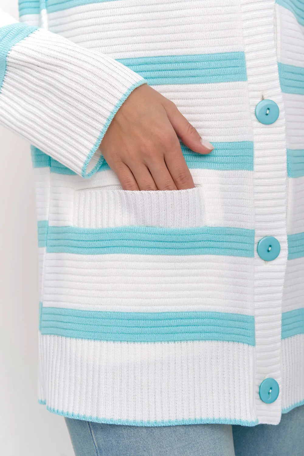Жакет женский вязаный полуприлегающего силуэта на пуговицах в полоску. V-образный вырез. Спущенная линия плеча, рукав длинный. Манжет рукава, низ изделия и планка выполнены  эластичная резинкой. Жакет выполнен из качественной пряжи с составом 30% хлопок 70% ПАН переплетением, образующим валики.  Легкий, яркий, эффектный жакет поддержит и деловой образ, и праздничное настроение. Отлично сочетается с любым низом в комплекте. Модель классическая, праздничная и повседневная, абсолютно на любой случай жизни. бело-мятный