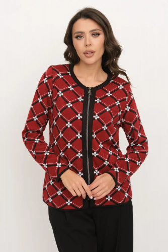 Жакет женский на молнии свободного силуэта со спущеной линией плеча. Круглая горловина. По бокам вязанного жакета два накладных кармана.  По низу изделия  проложен шнурок. Структурная вязка образует клетку. подойдет для любого типа фигуры и составит оригинальный, модный и женственный образ абсолютно с любым низом: юбка, брюки, джинсы. молочный