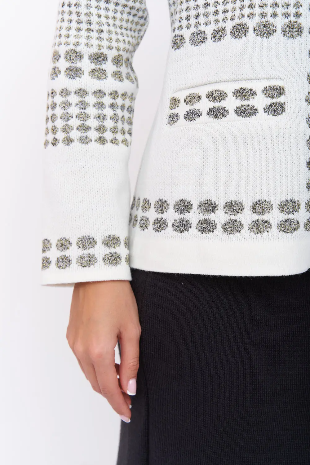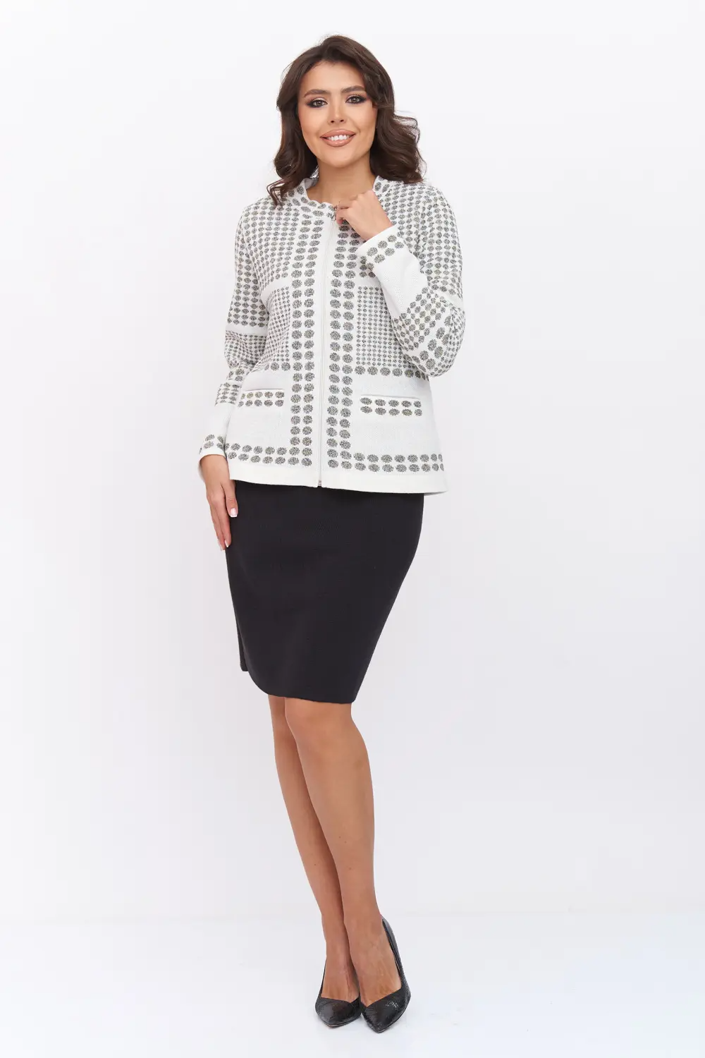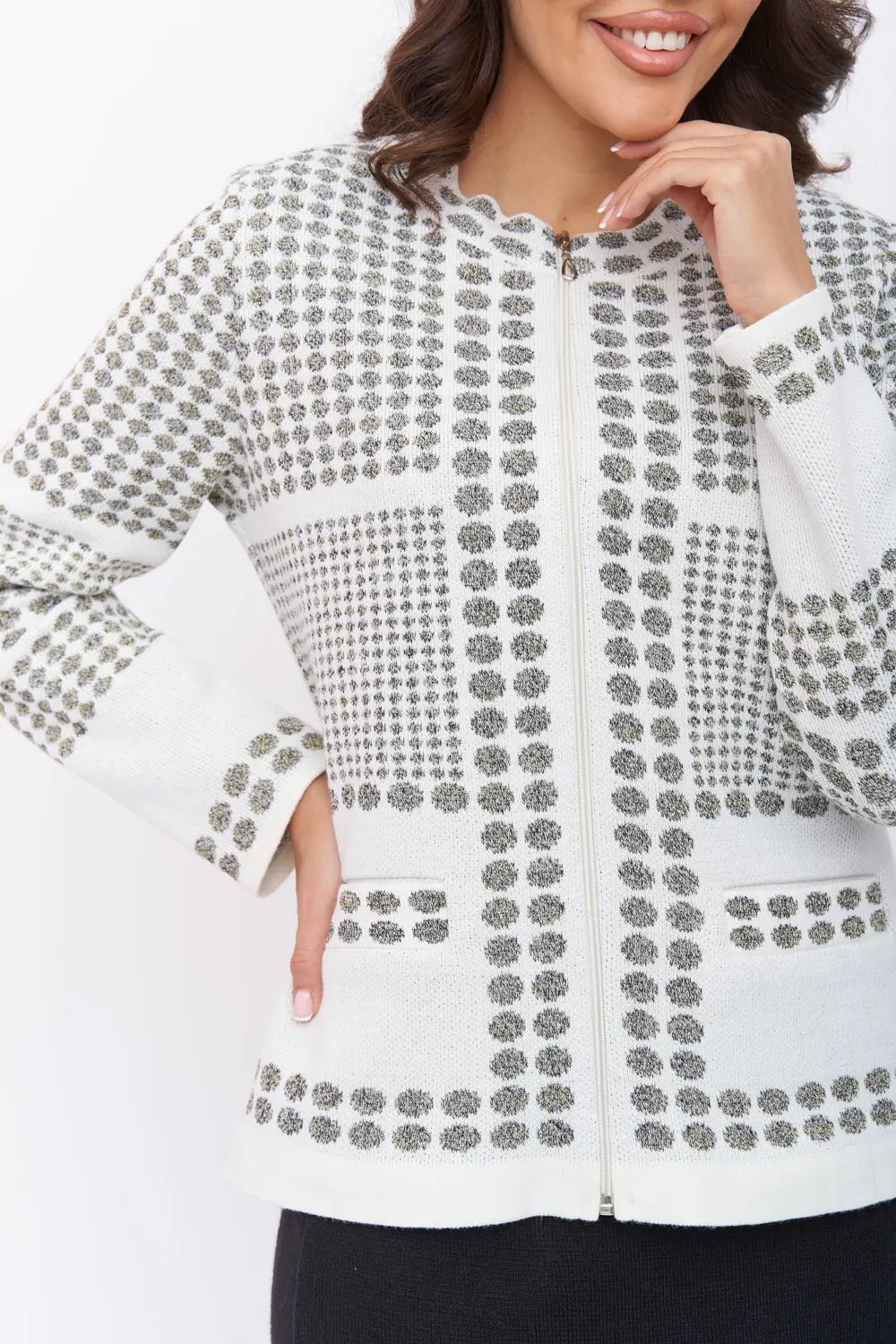 Женский вязаный жакет полуприлегающего силуэта на молнии. Рукава втачные, длинные. Жакет выполнен из качественной пряжи с составом 30% хлопок 70% ПАН с добавлением люрексовой нити. Модель имеет функциональные прорезные карманы с листочкой. Жакет выполнен жаккардовым переплетением с актуальным геометрическим рисунком,  имеет комфортную посадку по фигуре.  Эффектный жакет поддержит и деловой образ, и праздничное настроение. Отлично сочетается с любым низом в комплекте. Модель классическая, праздничная и повседневная, абсолютно на любой случай жизни. молочный