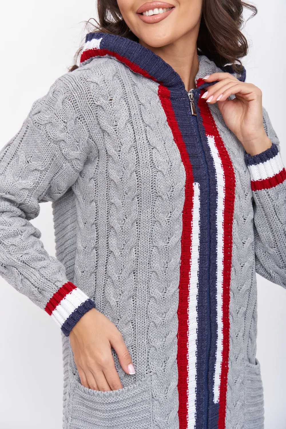 Жакет женский вязаный свободного силуэта, с капюшоном.  Спущеное плечо, рукав длинный. По низу рукава и изделия эластичная резинка. Жакет выполнен вязкой с объемными косами. Жакет декорирован контрастными полосами на капюшоне, манжетах и вдоль полочек. Оптимальный состав - пан-70%, шерсть - 30% - позволяет чувствовать себя комфортно в помещении. Жакет, благодаря свободному крою, подойдет для любого типа фигуры. серый
