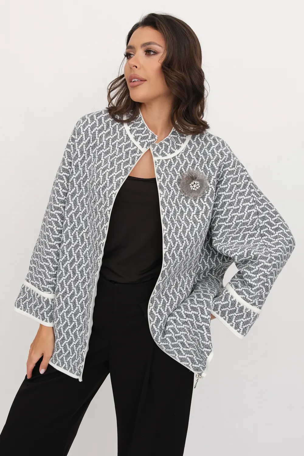 Жакет женский вязаный. Рукава цельнокроеные на манжете. Застежка на молнию. Воротник-стойка. Карманы в боковых швах. Очень эффектное жаккардовое полотно с рельефным мелким узором. молочный