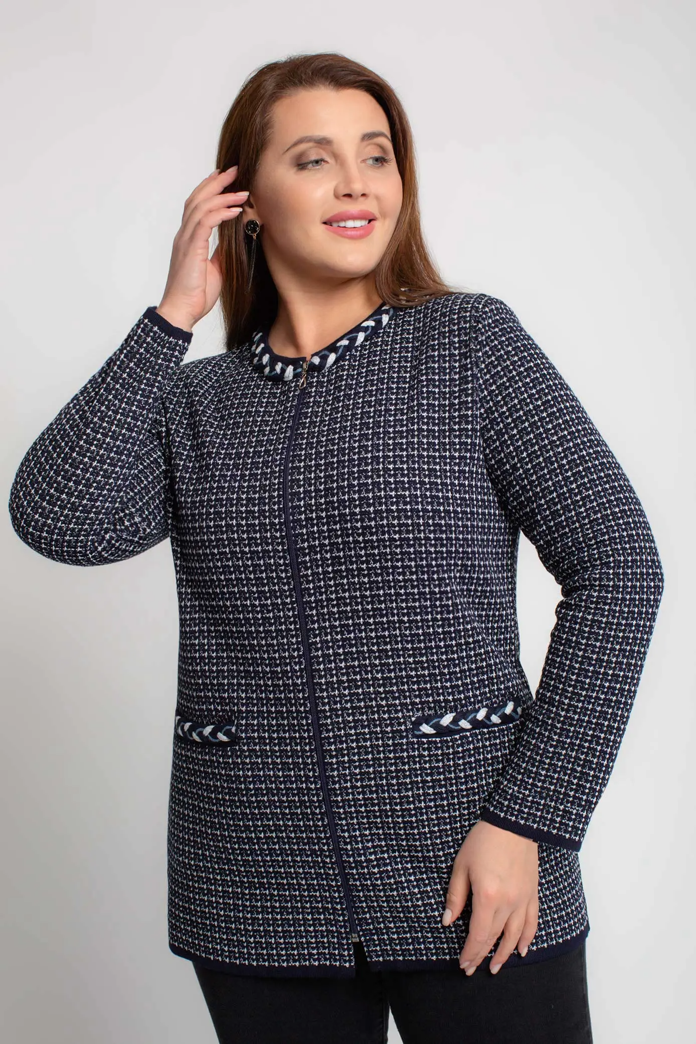 Жакет женский полуприлегающего силуэта с круглой горловиной.  Жакет вязаный на молнии.  Выполнен жаккардовым, структурным переплетением рисунок клетка. Горловина и  линия входа в карман декорированы  косами, которые выполнены из переплетающихся вязаных шнурков. т.синий