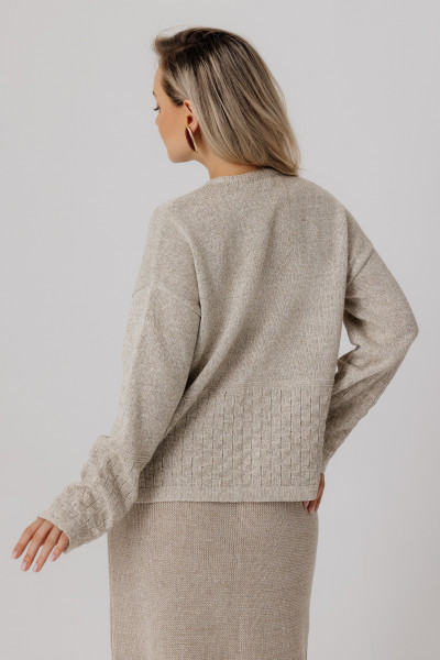 В нижней части жакета и на манжетах рукавов присутствует выраженная вязка с «шахматным» принтом, придающая изделию текстурность. Верхняя часть жакета выполнена более гладкой вязкой, что создаёт интересный контраст.