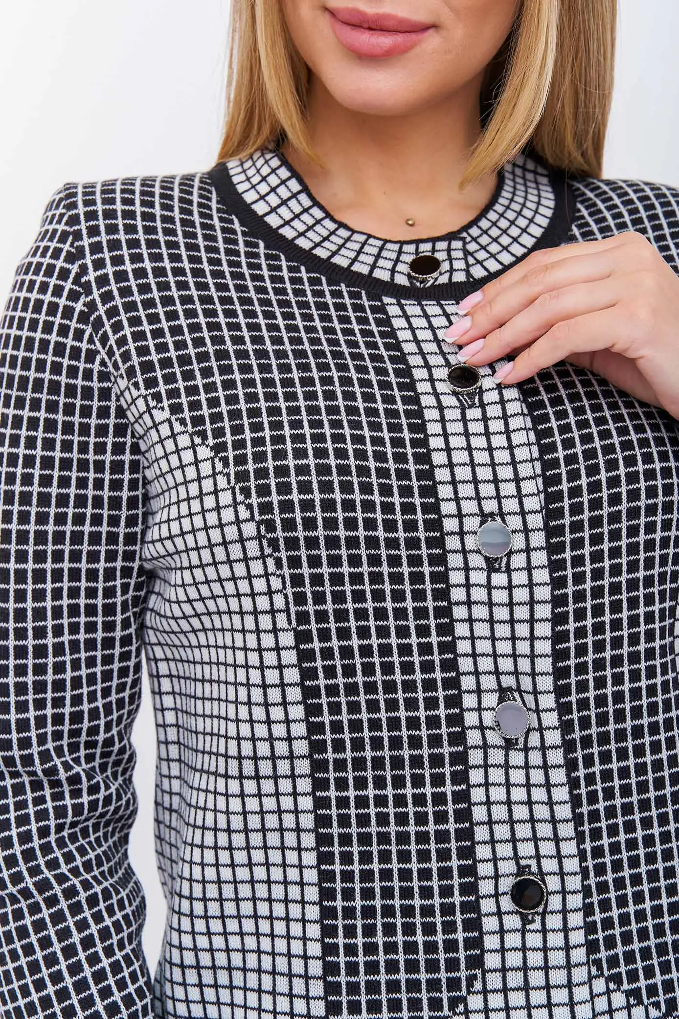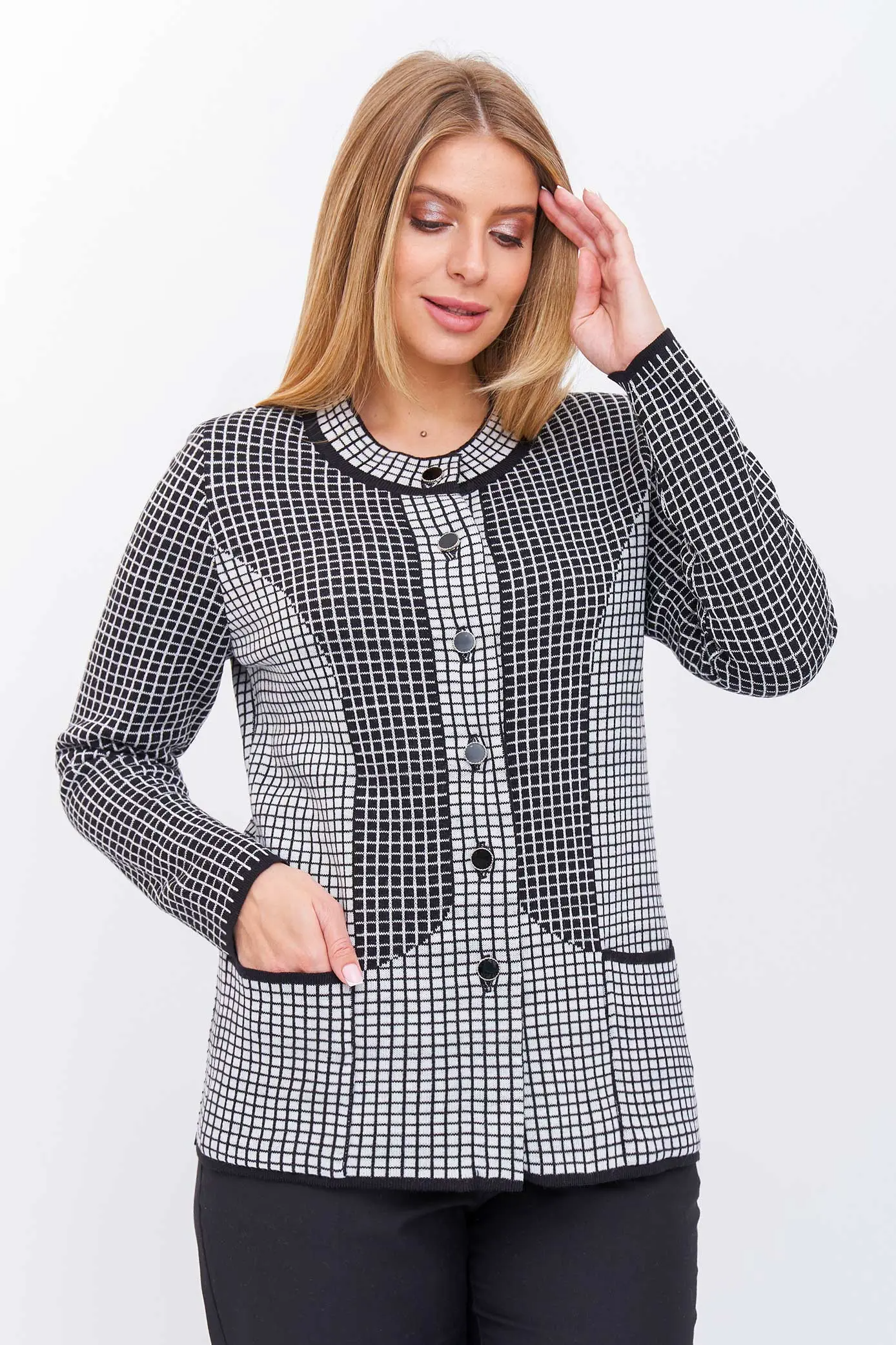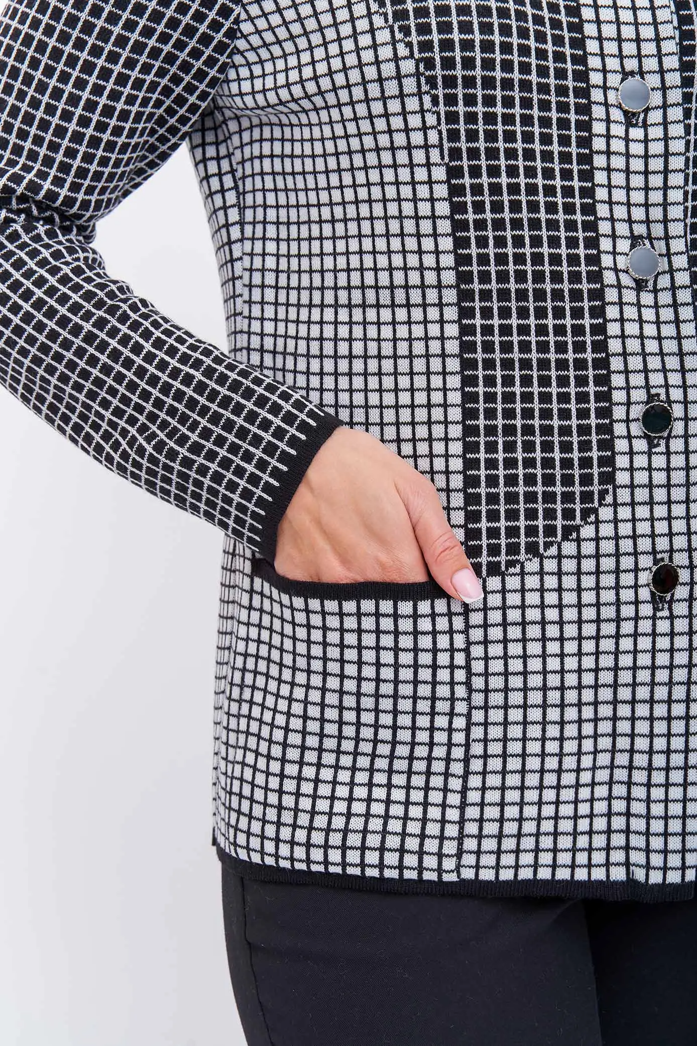 Жакет полуприталенного силуэта с длинным втачным рукавом. Жакет застегивается на пуговицы. Рельефные линии проходят по переду от серединый проймы до низа изделия создает хорошую посадку по фигуре. По переду расположены горизонтальные прорезные карманы. Горловина обработана оригинальным воротником с повторением жаккардового рисунка "мелкий кубик" Горловина, вход в карман, низ изделия и низ рукавов отделаны бейкой черного цвета. Отличное дополнение рабочего стиля в одежде. черный