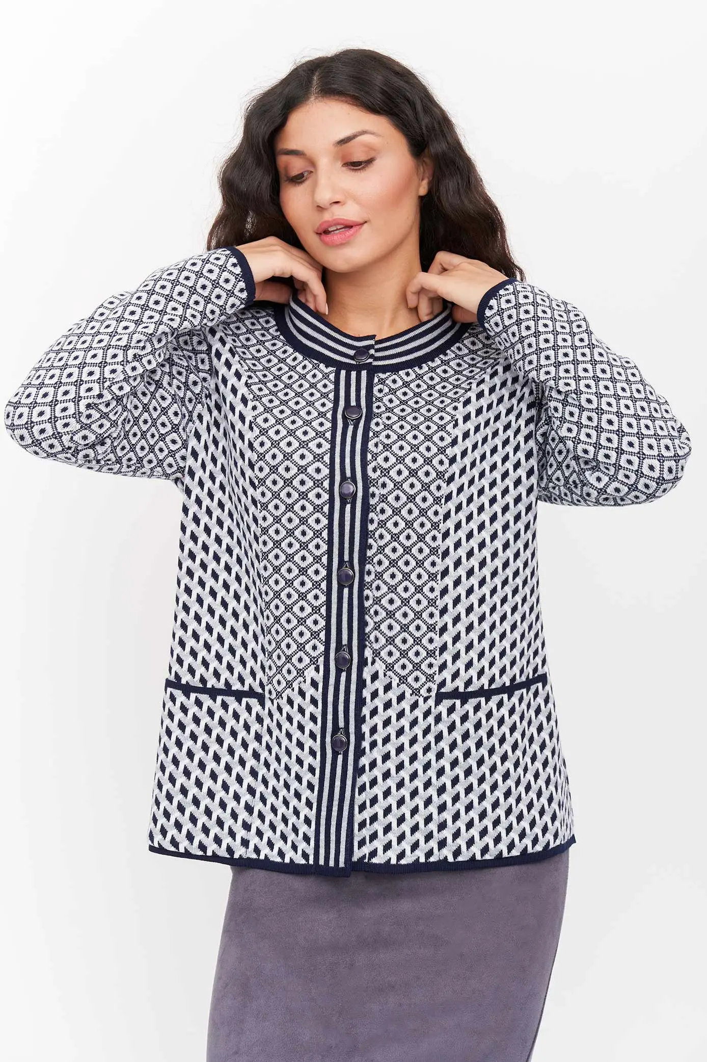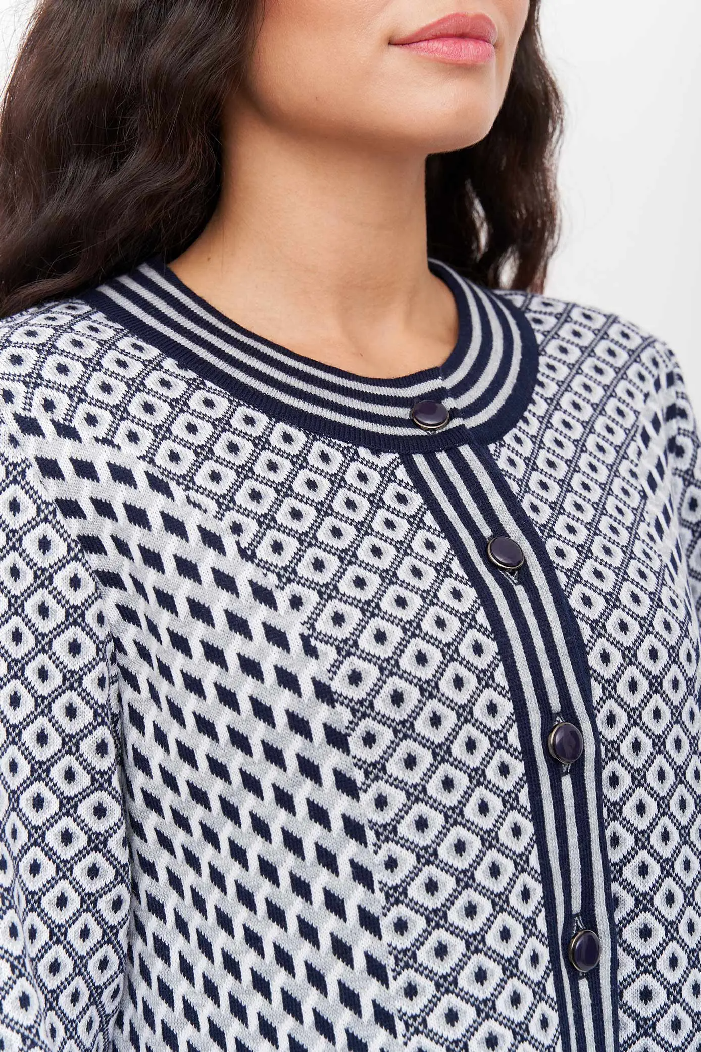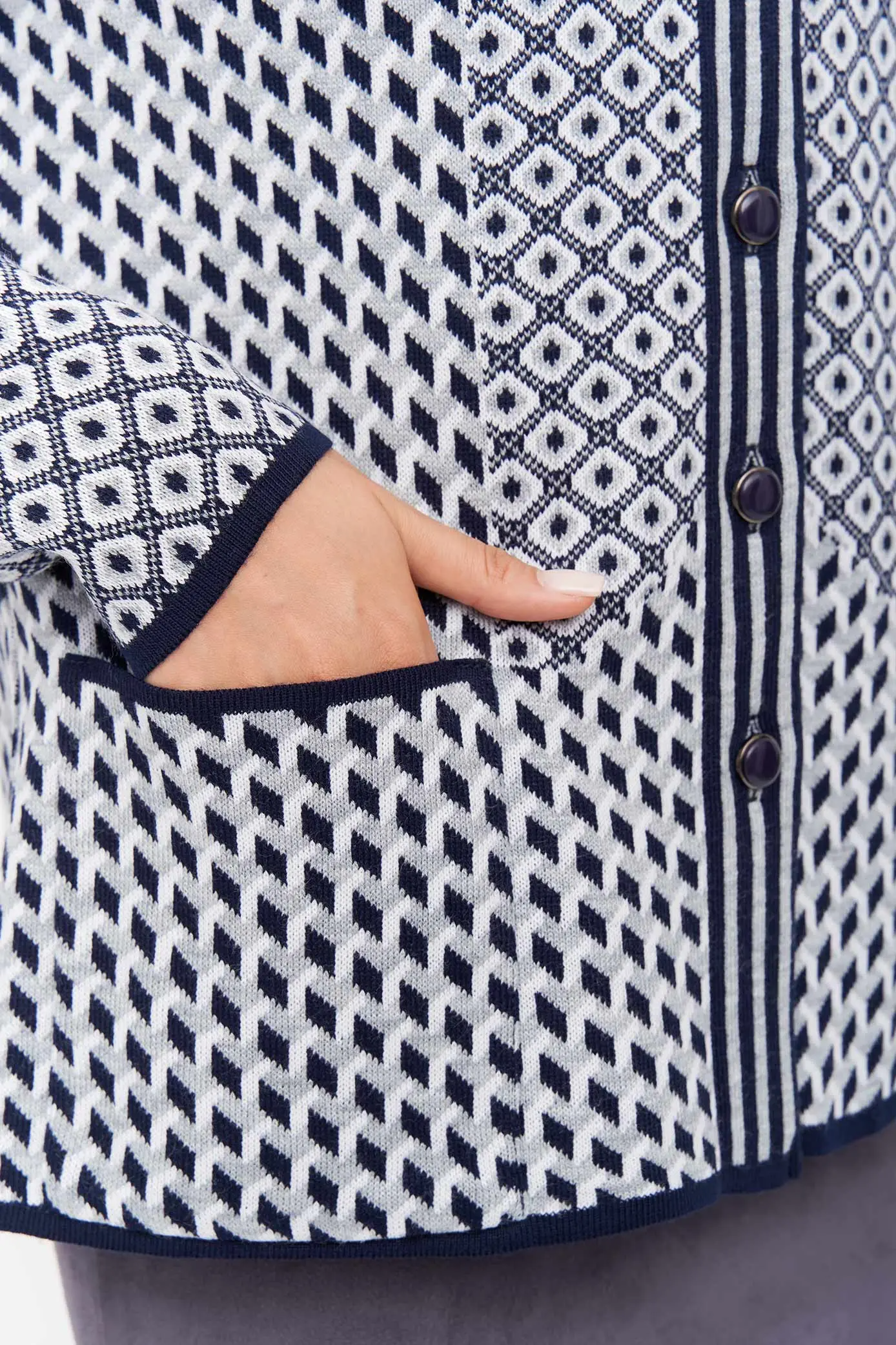 Женский трикотажный жакет полуприлегающего силуэта. Рукава втачные длинные. Жакет застегивается на пуговицы, горловина круглая. Два прорезных кармана. Изделие выполнено жаккардовым переплетние образующим геометрический рисунок "ромб" синий