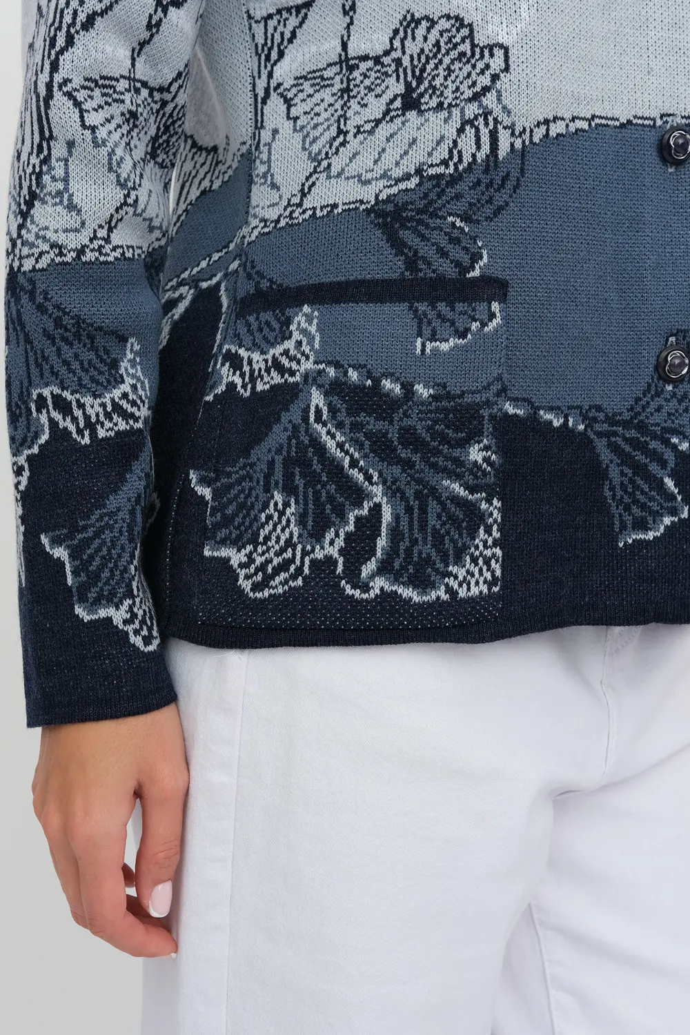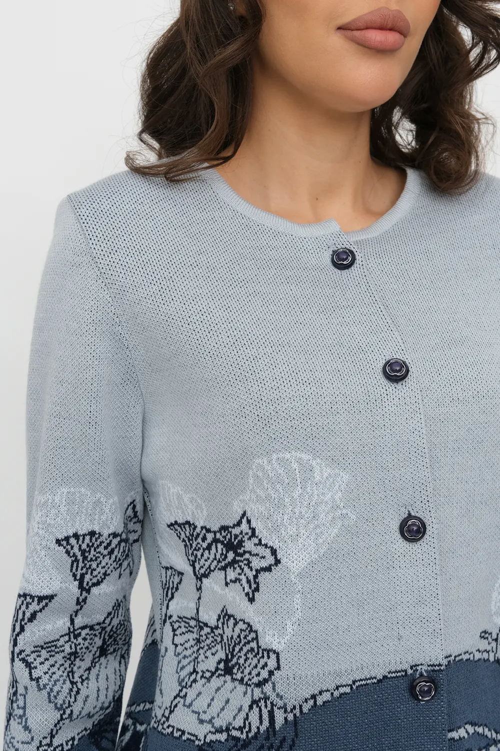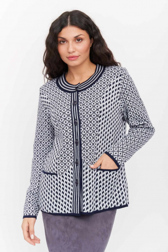 Женский трикотажный жакет полуприлегающего силуэта. Рукава втачные длинные. Жакет застегивается на пуговицы, горловина круглая. Два прорезных кармана. Изделие выполнено жаккардовым переплетние образующим геометрический рисунок "ромб" джинс