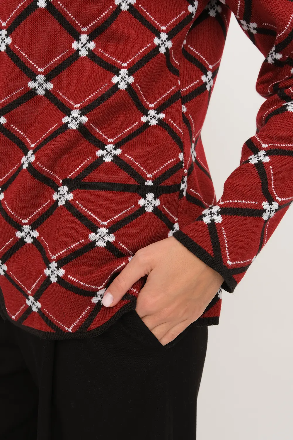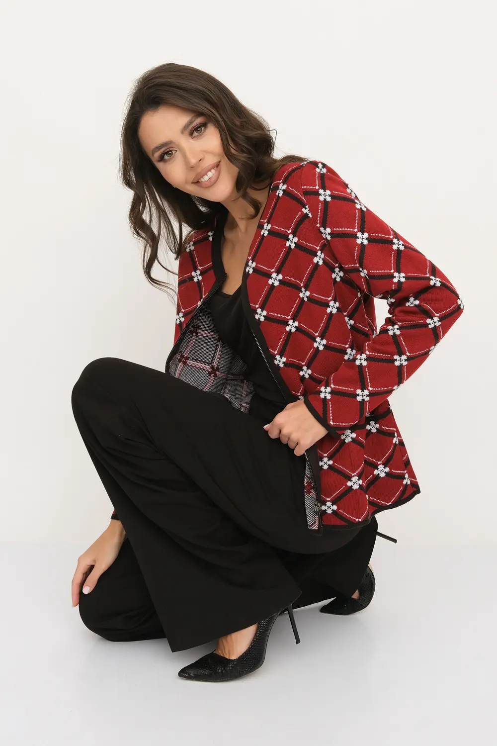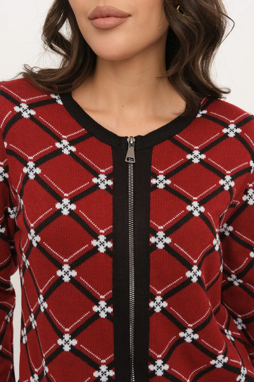 Женский трикотажный жакет полуприлегающего силуэта. Рукава втачные длинные. Жакет застегивается на молнию, горловина круглая. Два накладных кармана квадратной формы. Изделие выполнено жаккардовым переплетние образующим геометрический рисунок. Горловина, низ изделия и низ рукавов, обработка молнии выполнены гладким переплетением в контрастном цвете. красный