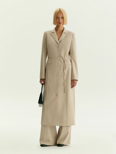 Многофункциональная вещь, которая станет основой множества образов. Платье-жакет-плащ из костюмной ткани с вискозой выполнено в универсальном молочно-бежевом оттенке и украшено тонкой полоской. Один из главных принтов сезона не теряет актуальность, смотрится элегантно и уместен в деловом гардеробе. Изделие дополнено тонким съемным поясом. Такую вещь можно носить самостоятельно или в сочетаниях с топами, брюками, боди, джинсами и другими дополнениями по настроению. У изделия имеется подкладка с высоким содержанием вискозы