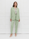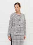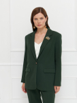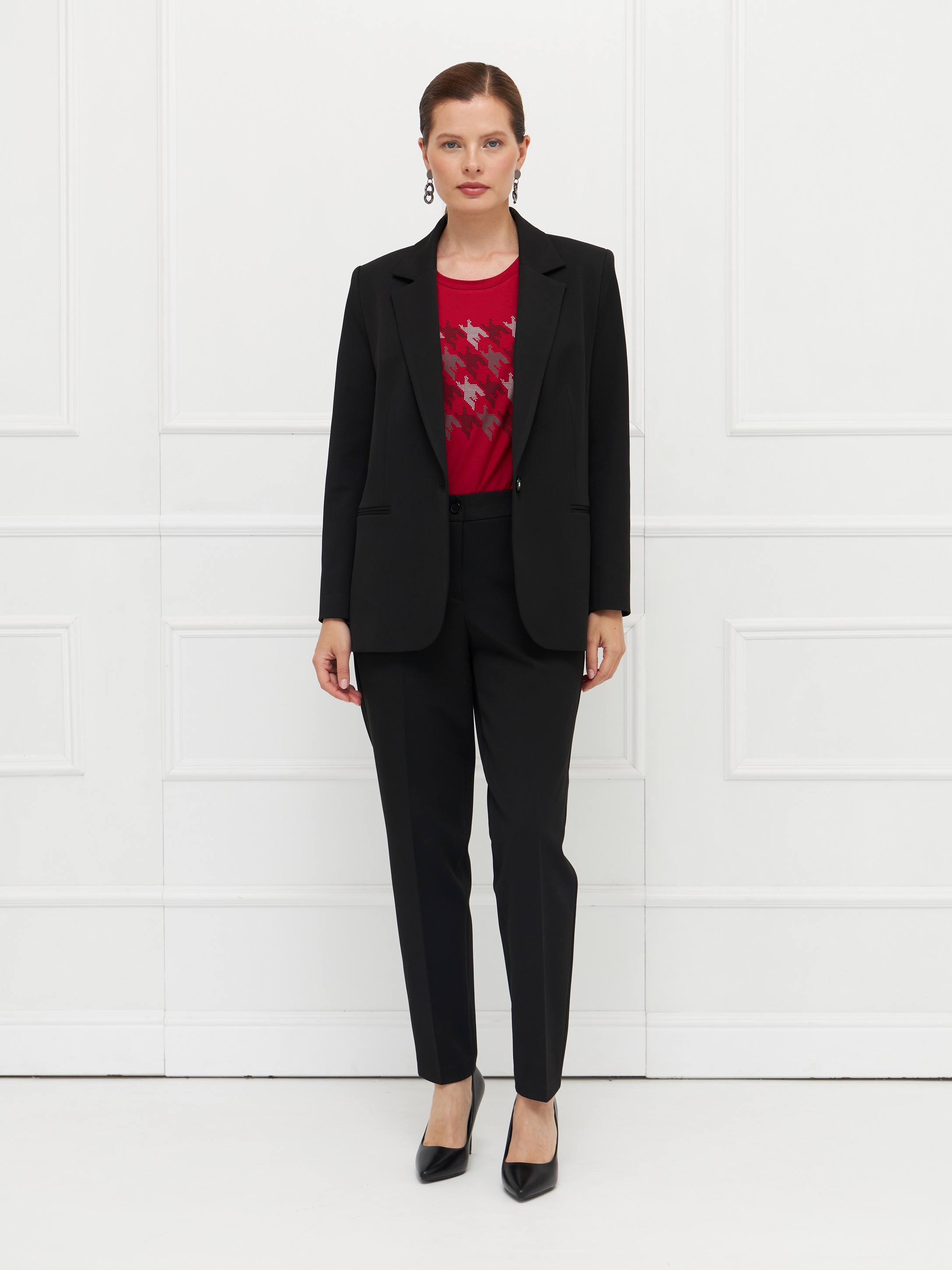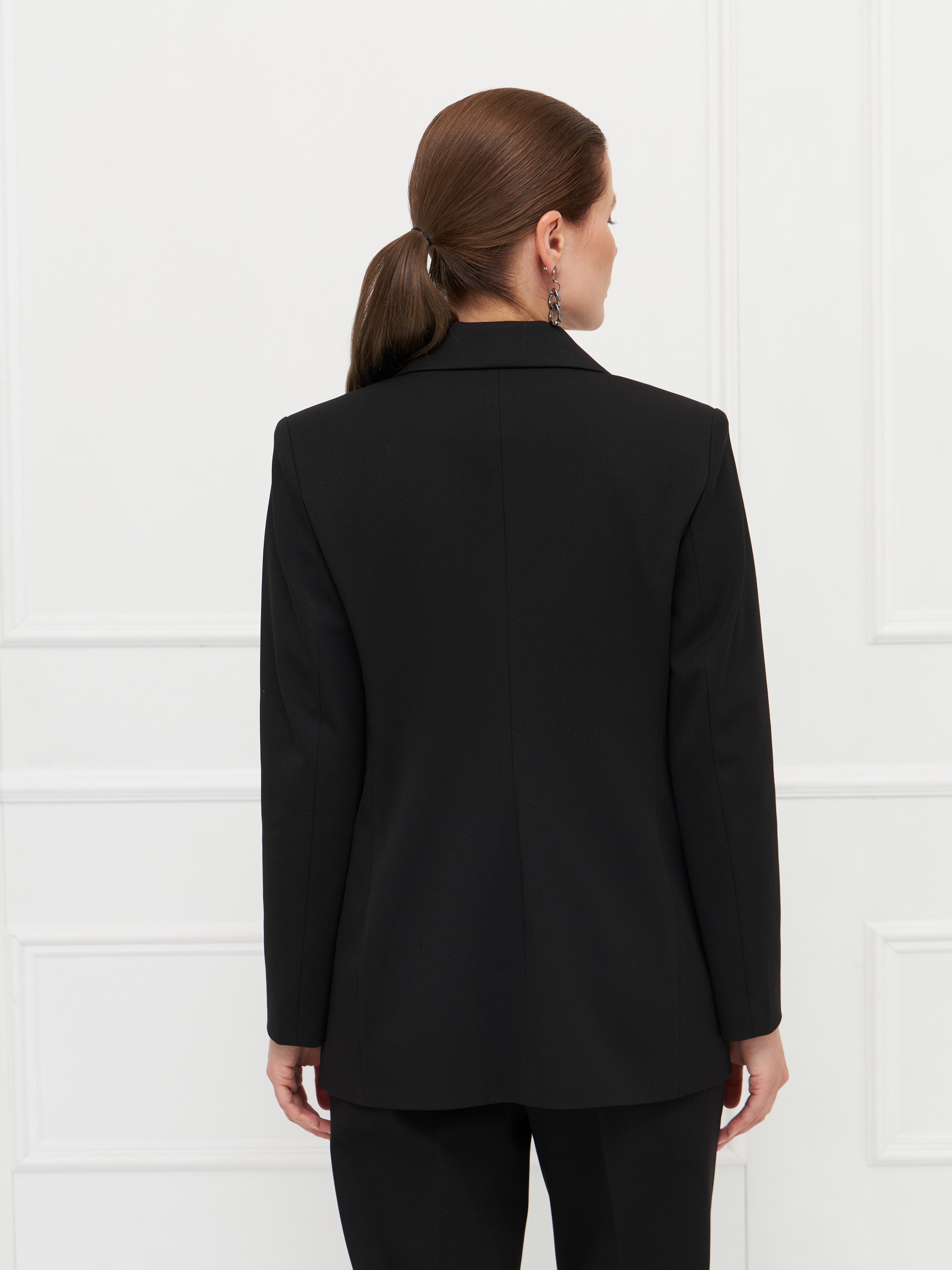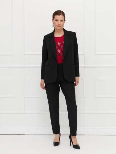 Черный жакет полуприлегающего силуэта выполнен в строгом классическом стиле. Модель застегивается на одну пуговицу, что подчеркивает вертикаль силуэта и сохраняет лаконичность образа. Карманы в рамку добавляют аккуратный конструктивный акцент. Жакет сшит из плотной ткани, которая хорошо держит форму и подходит для межсезонья. Контрастная подкладка становится незаметной, но выразительной деталью. Универсальная модель для делового гардероба, сочетается как с брюками, так и с юбками. На фото в паре Брюки Б-703 АКД(О5).