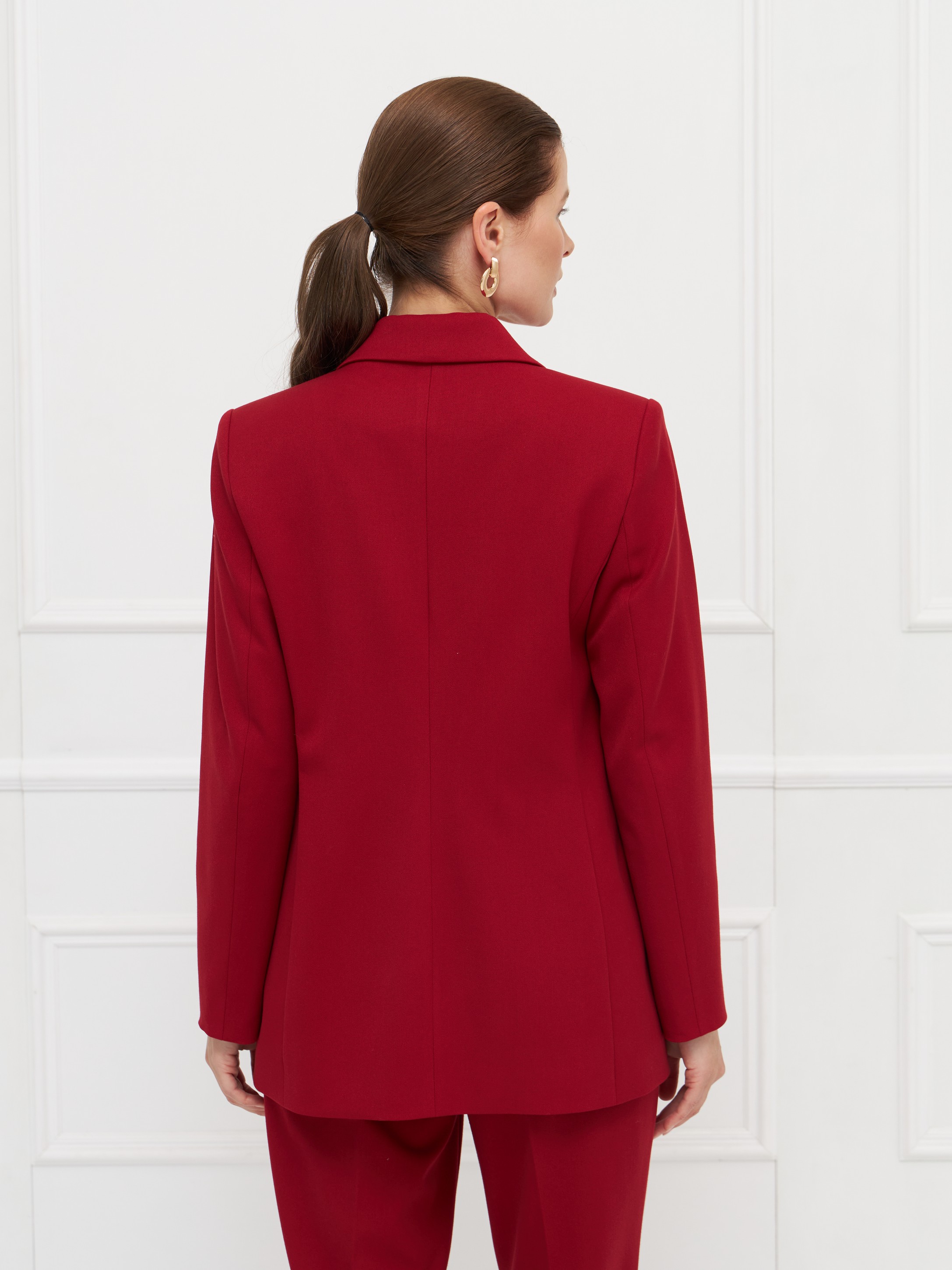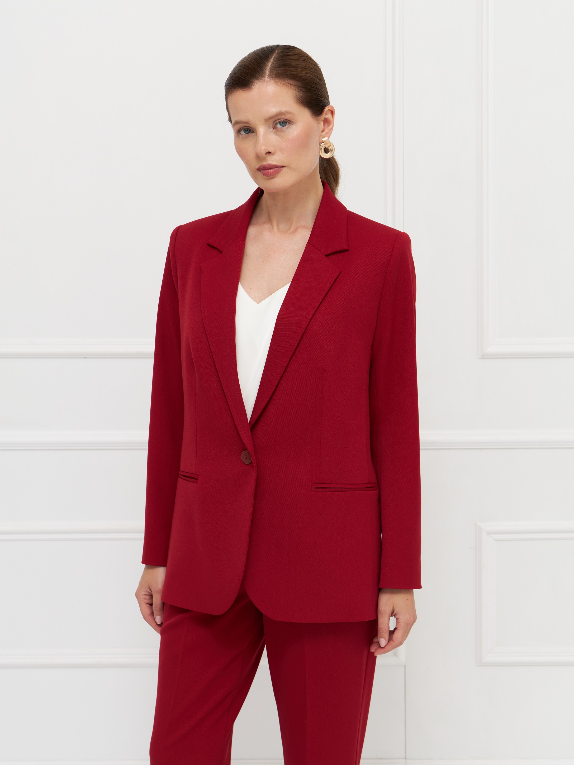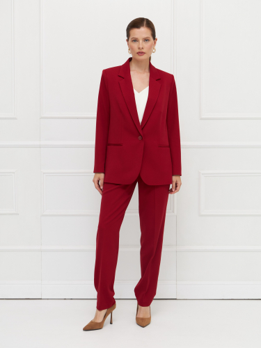 Жакет полуприлегающего силуэта выполнен из мягкой поливискозной ткани глубокого красного оттенка. Модель застегивается на одну пуговицу, сохраняя чистоту линий и аккуратный внешний вид. Прорезные карманы подчеркивают сдержанный дизайн и не утяжеляют силуэт. Ткань комфортна в носке, хорошо драпируется и подходит для длительного использования. Жакет на подкладке. Универсальная модель для делового гардероба с акцентом на цвет. На фото в паре Брюки Б-802 ГВД(О5).