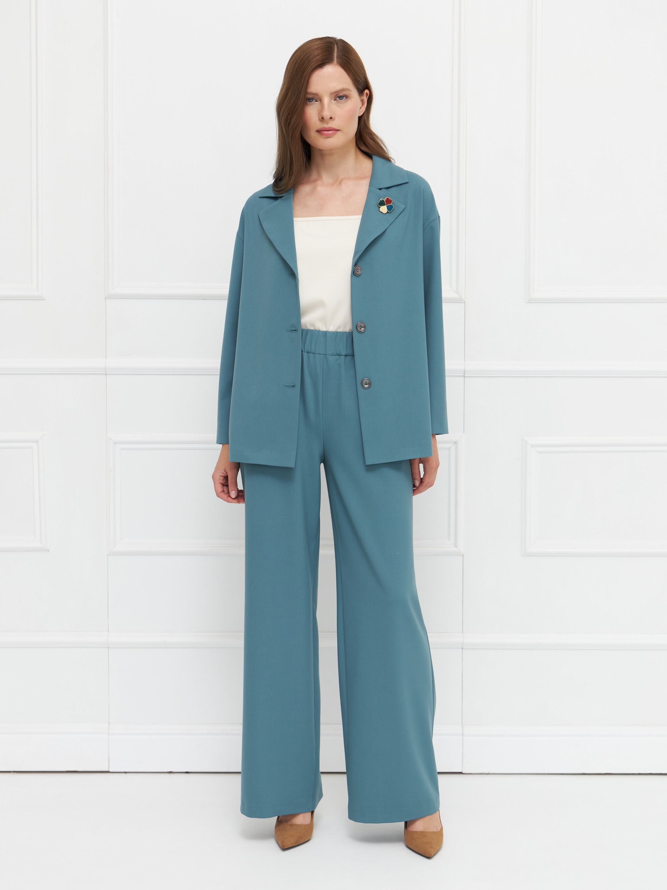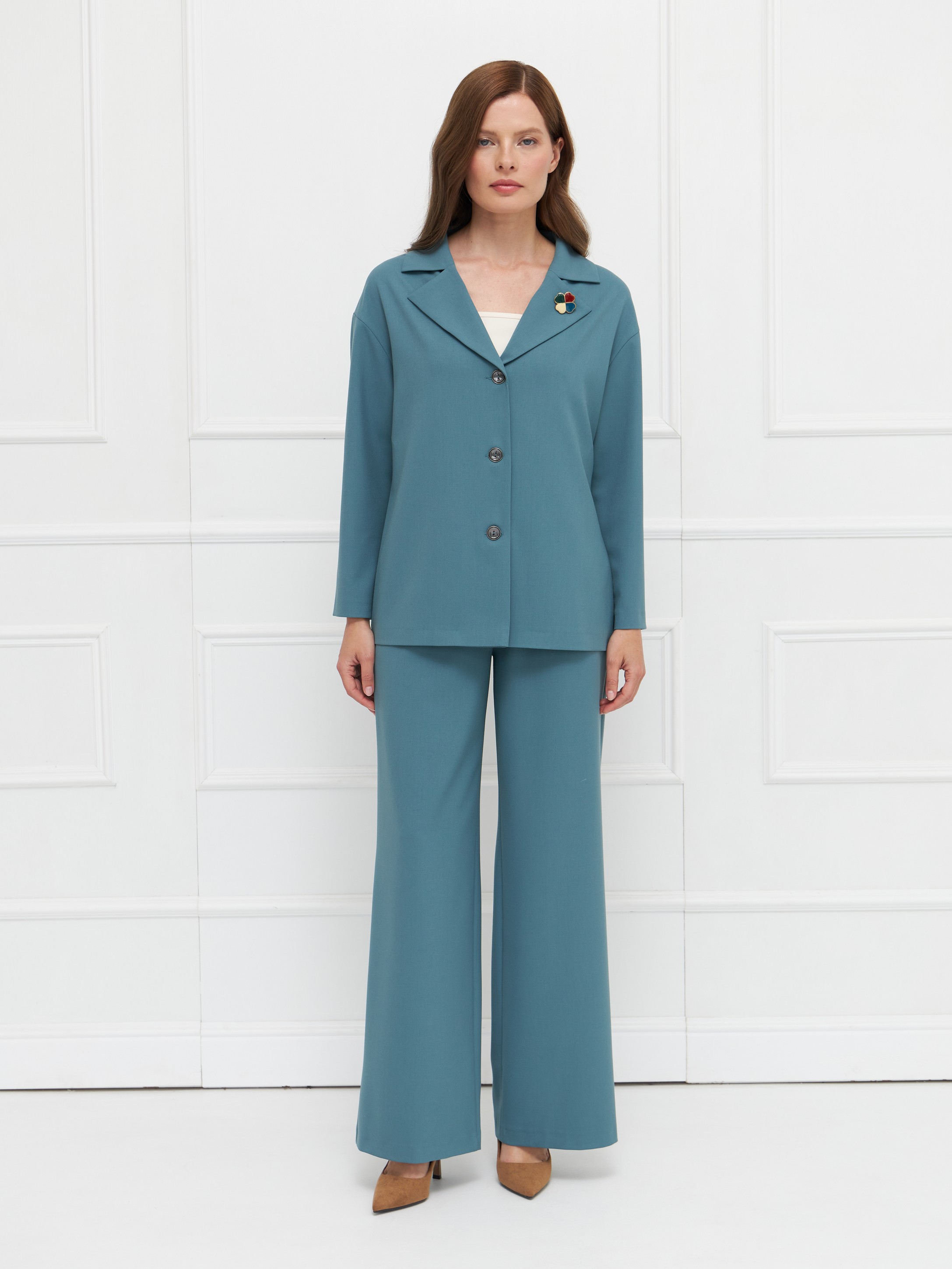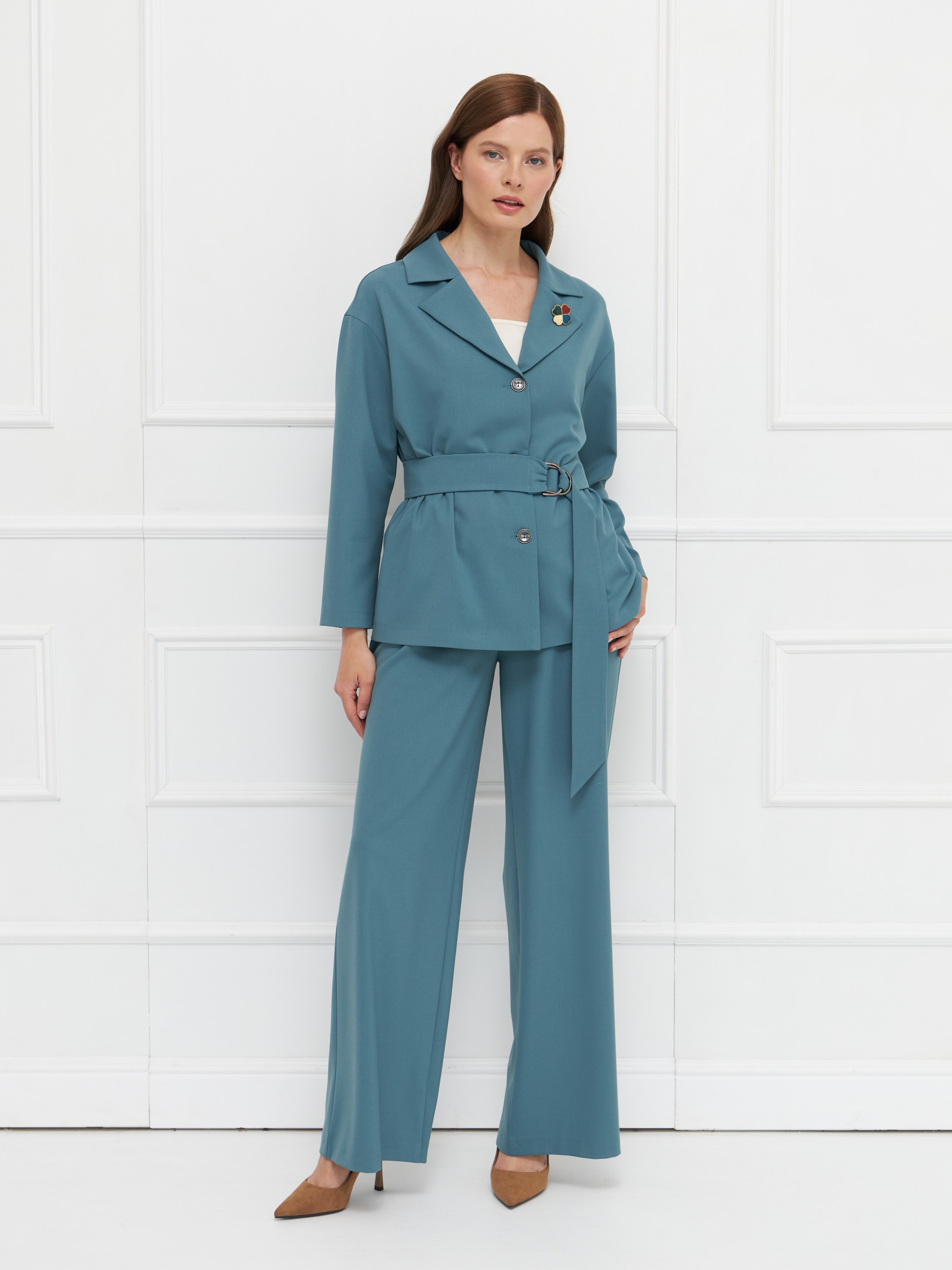 Жакет цвета шалфея выполнен из поливискозной ткани, которая не мнется и приятна к телу. Модель без подкладки имеет мягкую форму благодаря свободному крою и спущенной линии плеча, создавая комфортный и современный силуэт. Широкий воротник и лацканы добавляют выразительности, а застежка на три пуговицы сохраняет классическую структуру. Пояс с пряжкой подчёркивает талию и завершает образ. Этот жакет отлично подходит для создания стильных и удобных повседневных комплектов. На фото в паре Брюки Б-900 ШАЛ(О5).