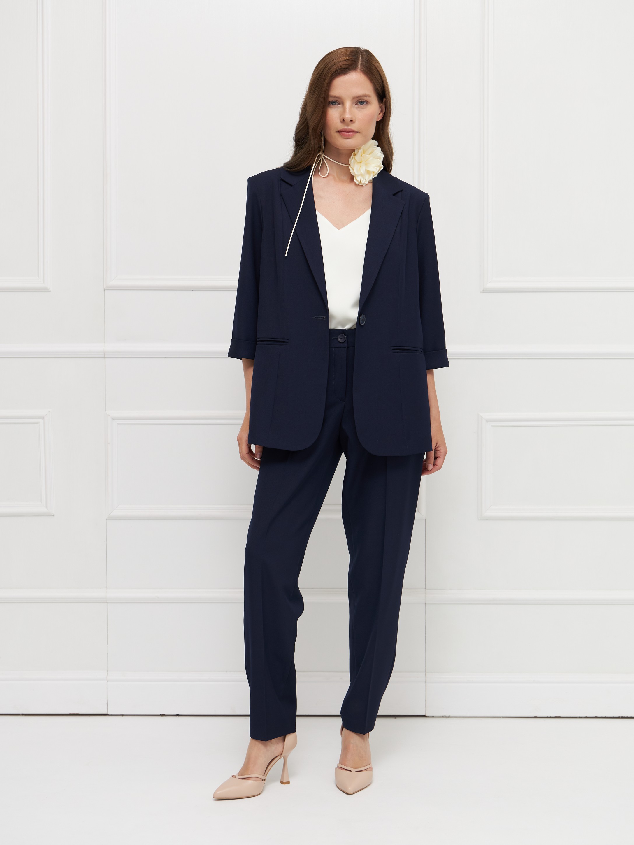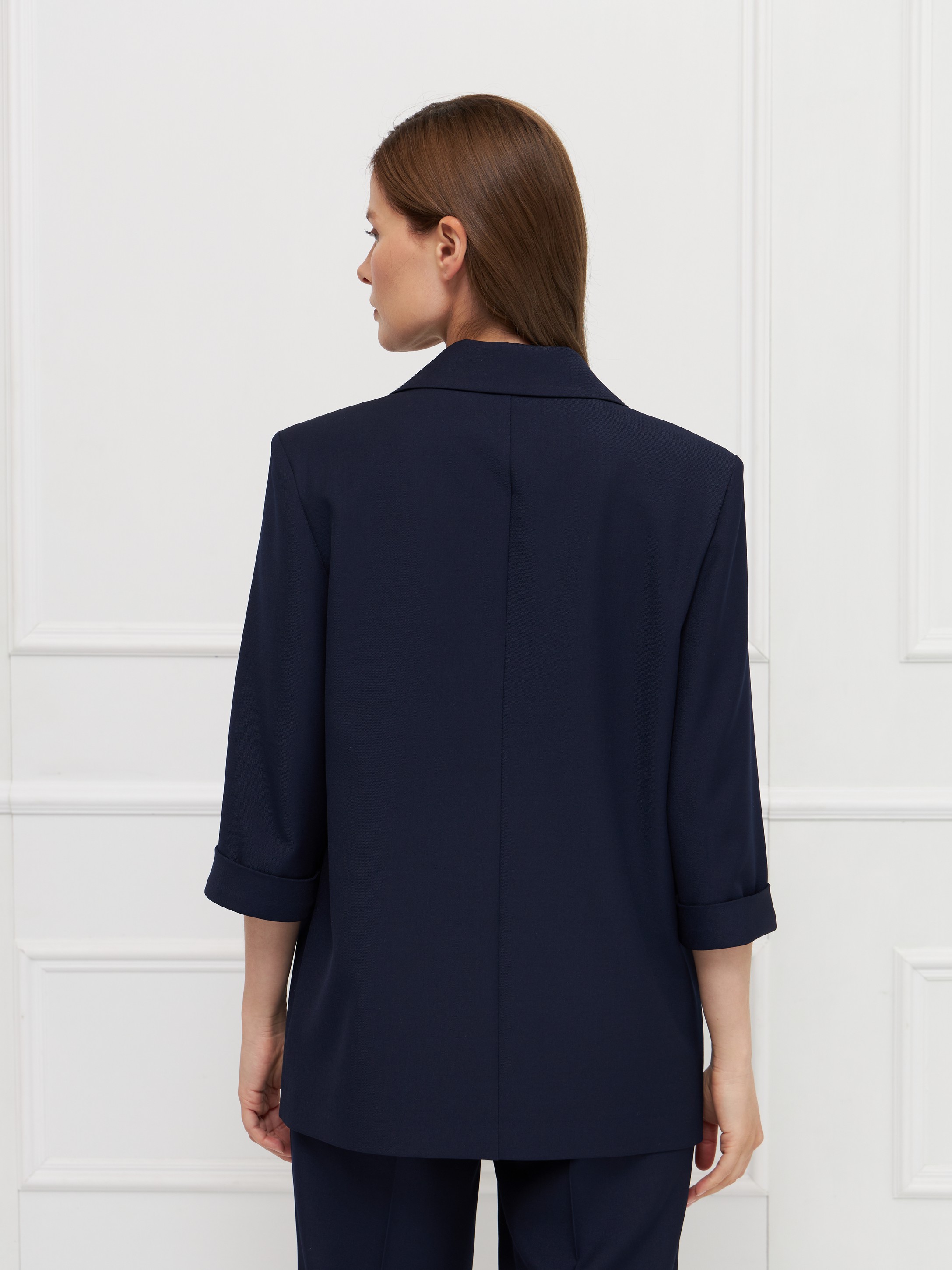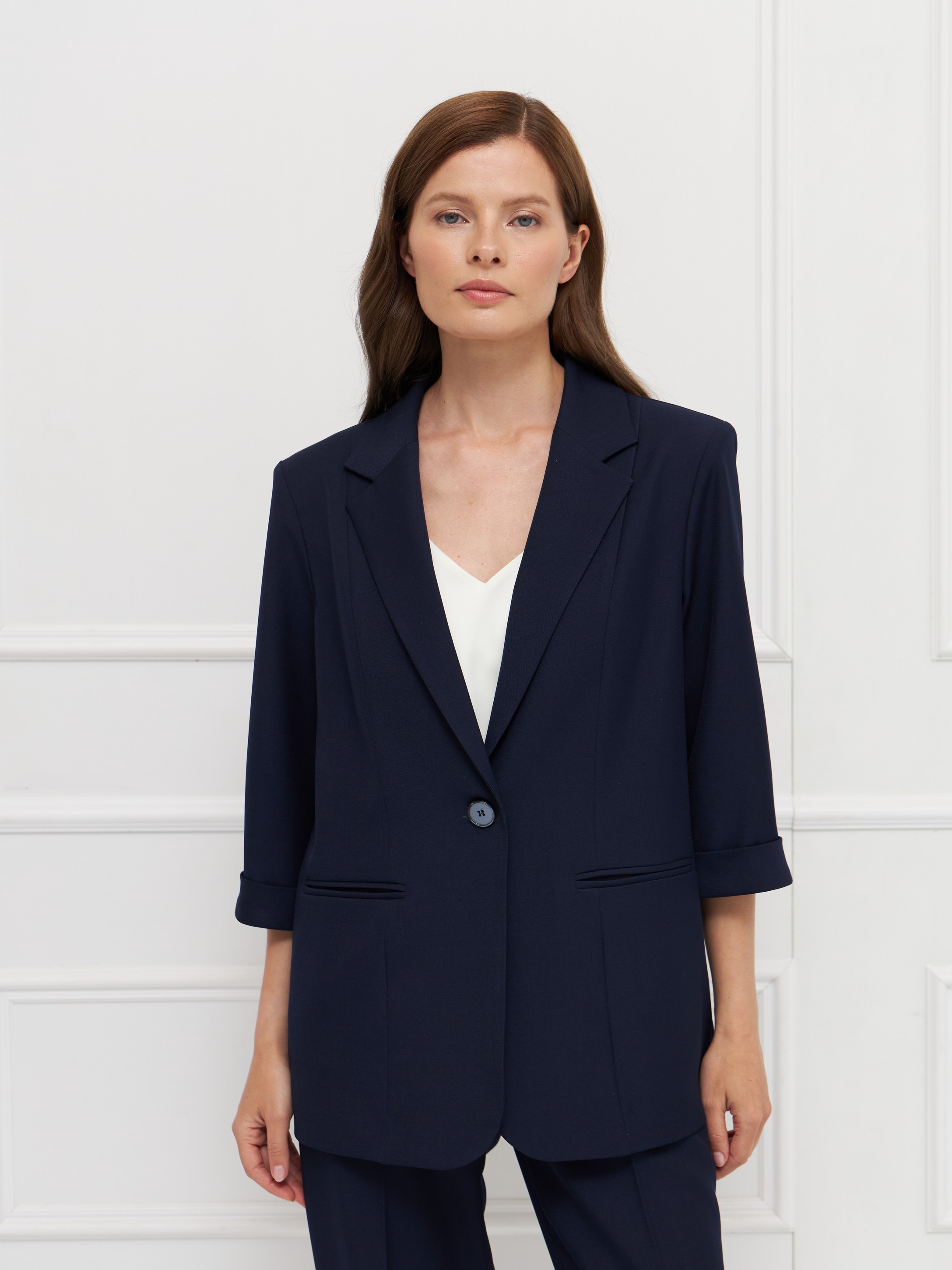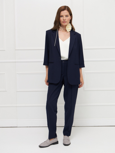 Жакет насыщенного синего цвета выполнен в классическом прямом крое с четкими прямыми плечами. Узкие лацканы придают модели современный и сдержанный вид. Прорезные карманы добавляют функциональности, не нарушая лаконичности силуэта. Застежка на одну пуговицу сохраняет строгий стиль, а рукава длиной 7/8 с аккуратными отворотами добавляют легкую неформальность. Жакет выполнен из плотной ткани, которая хорошо держит форму, и не имеет подкладки, что обеспечивает комфорт и легкость. Идеальный выбор для деловых встреч и официальных мероприятий. На фото в паре Брюки Б-704 ДВС(О5).