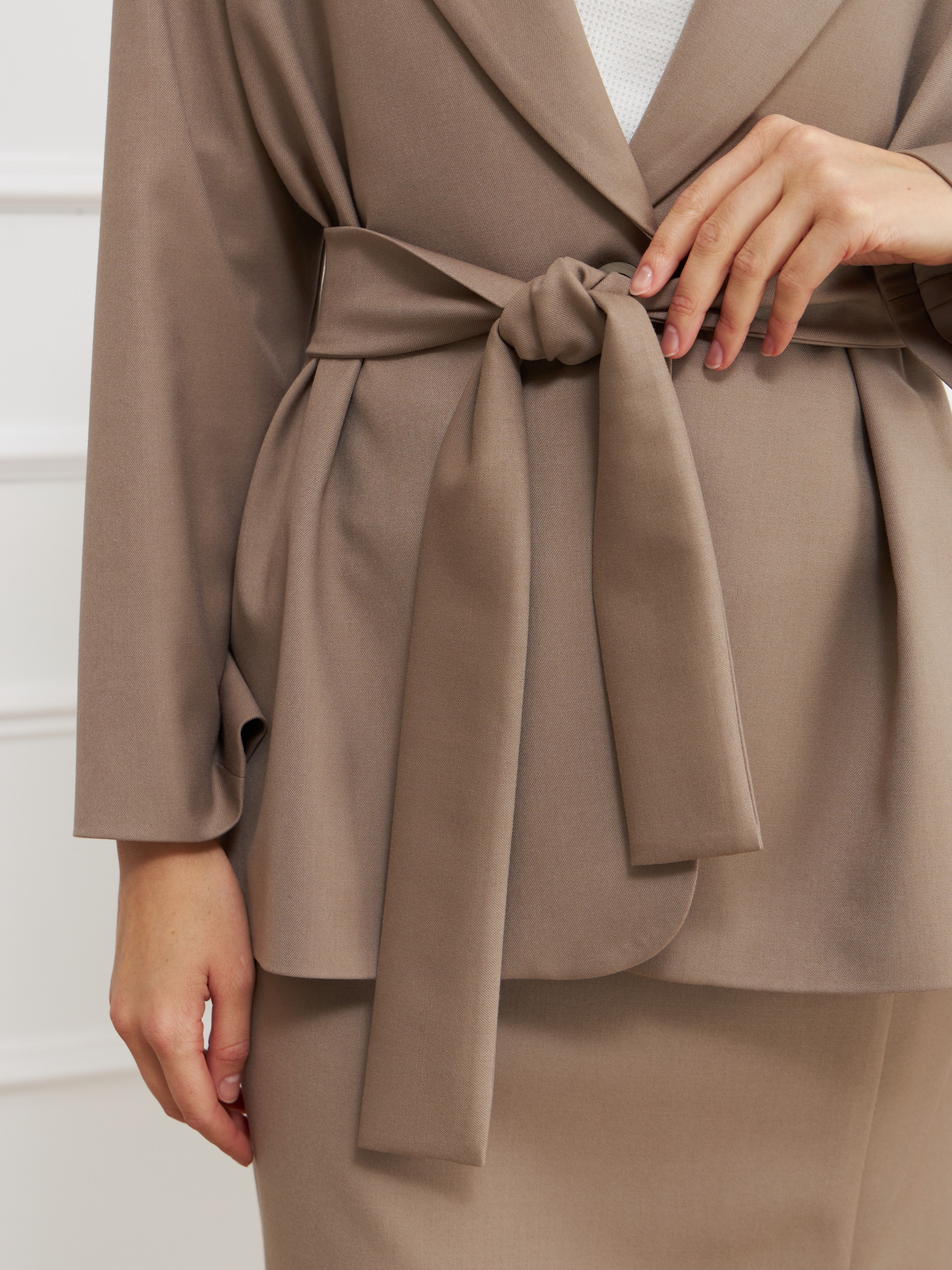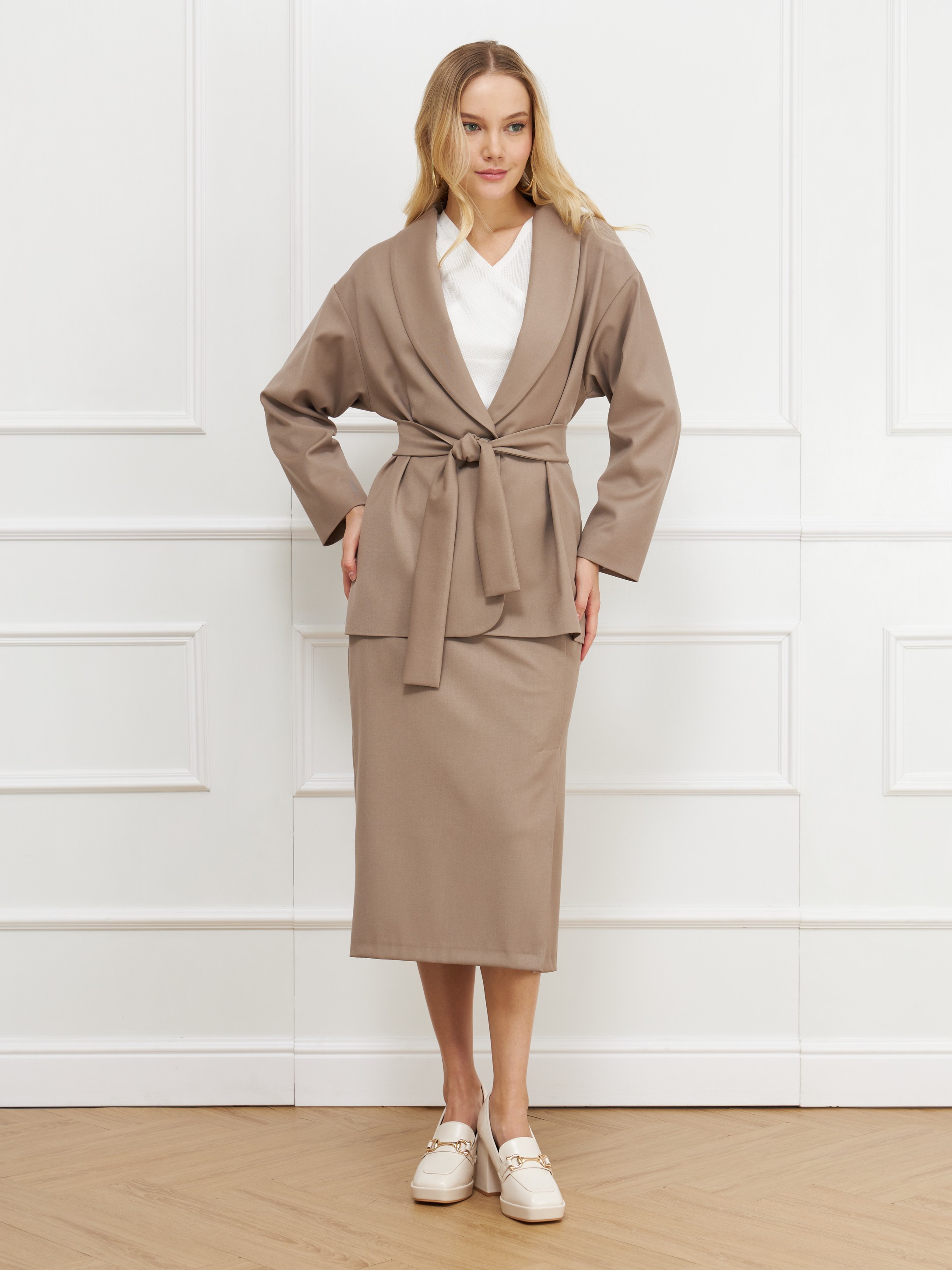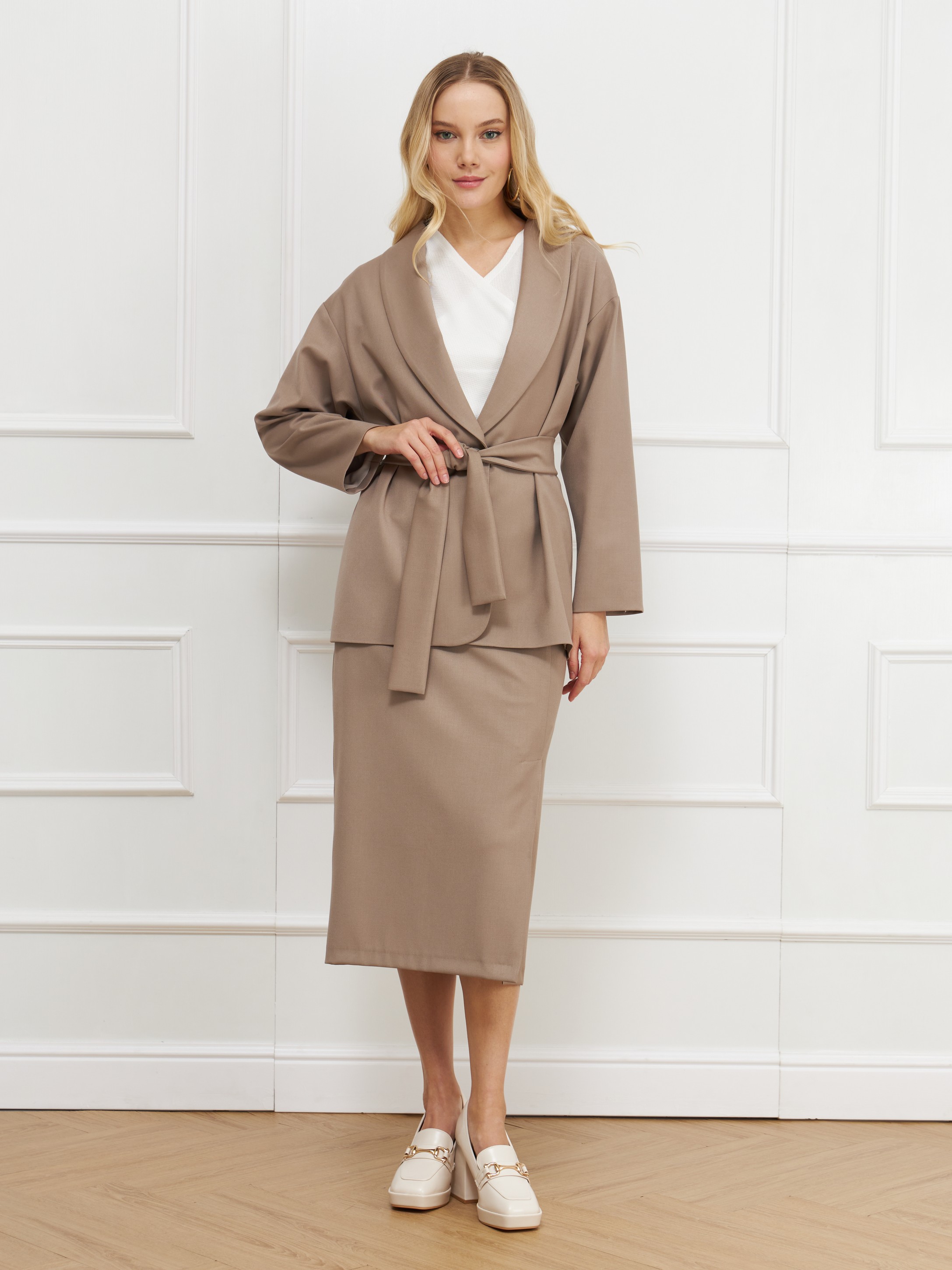 Жакет песочного оттенка свободного силуэта с мягкой линией плеча и широким воротником- шалька станет удачной инвестицией в повседневный гардероб. Для пошива модели использовали тонкий костюмный материал, поэтому изделие получилось легким, воздушным. Модель на эластичном подкладе с застежкой на одну пуговицу дополнили длинным поясом, формирующим приталенный силуэт. На фото жакет представлен с юбкой А-2005 ГОЭ(О4).