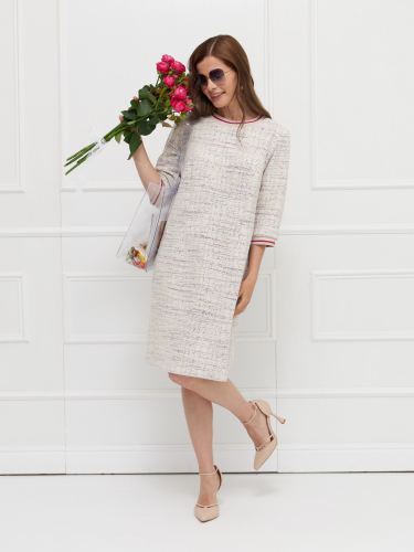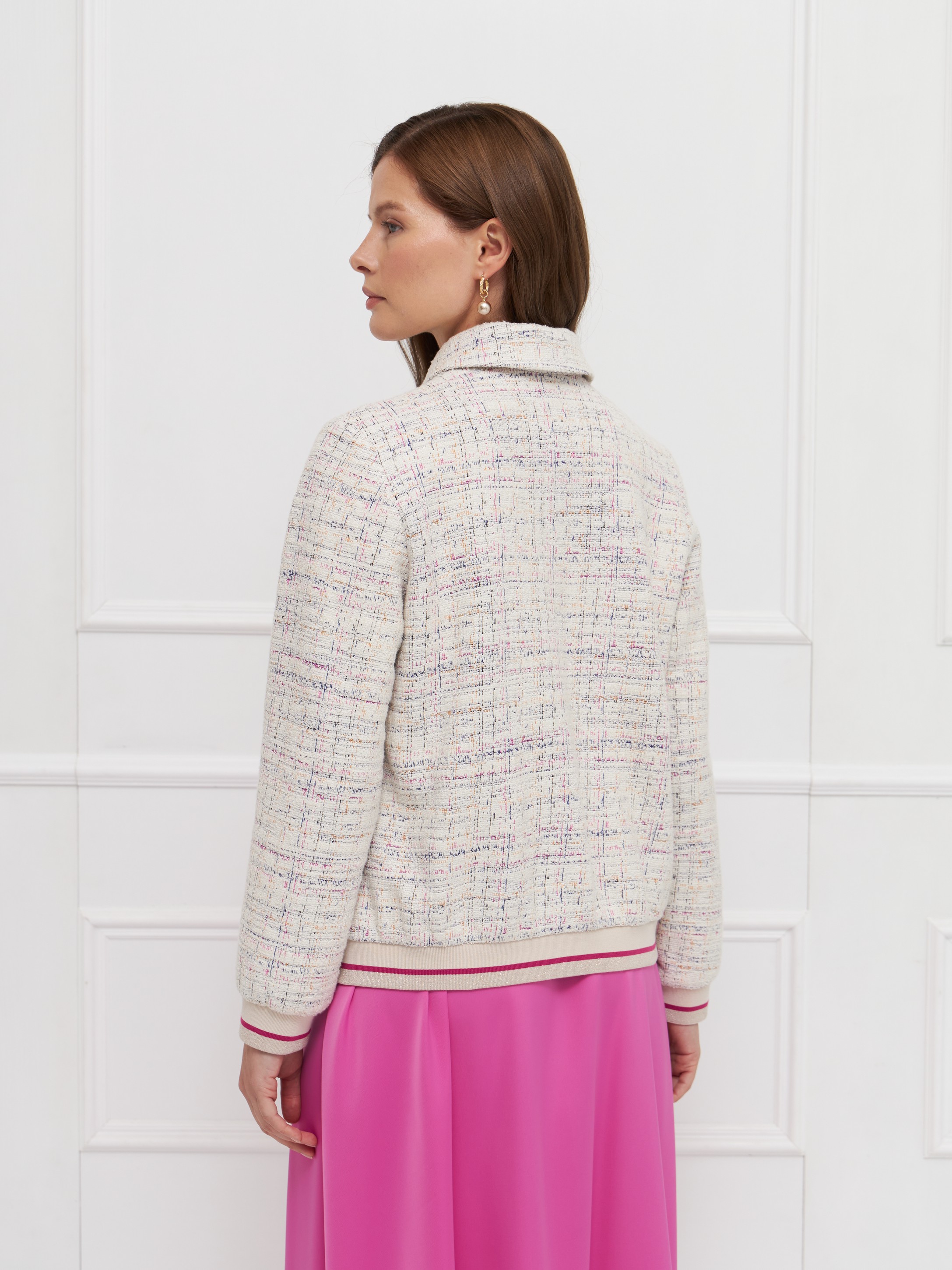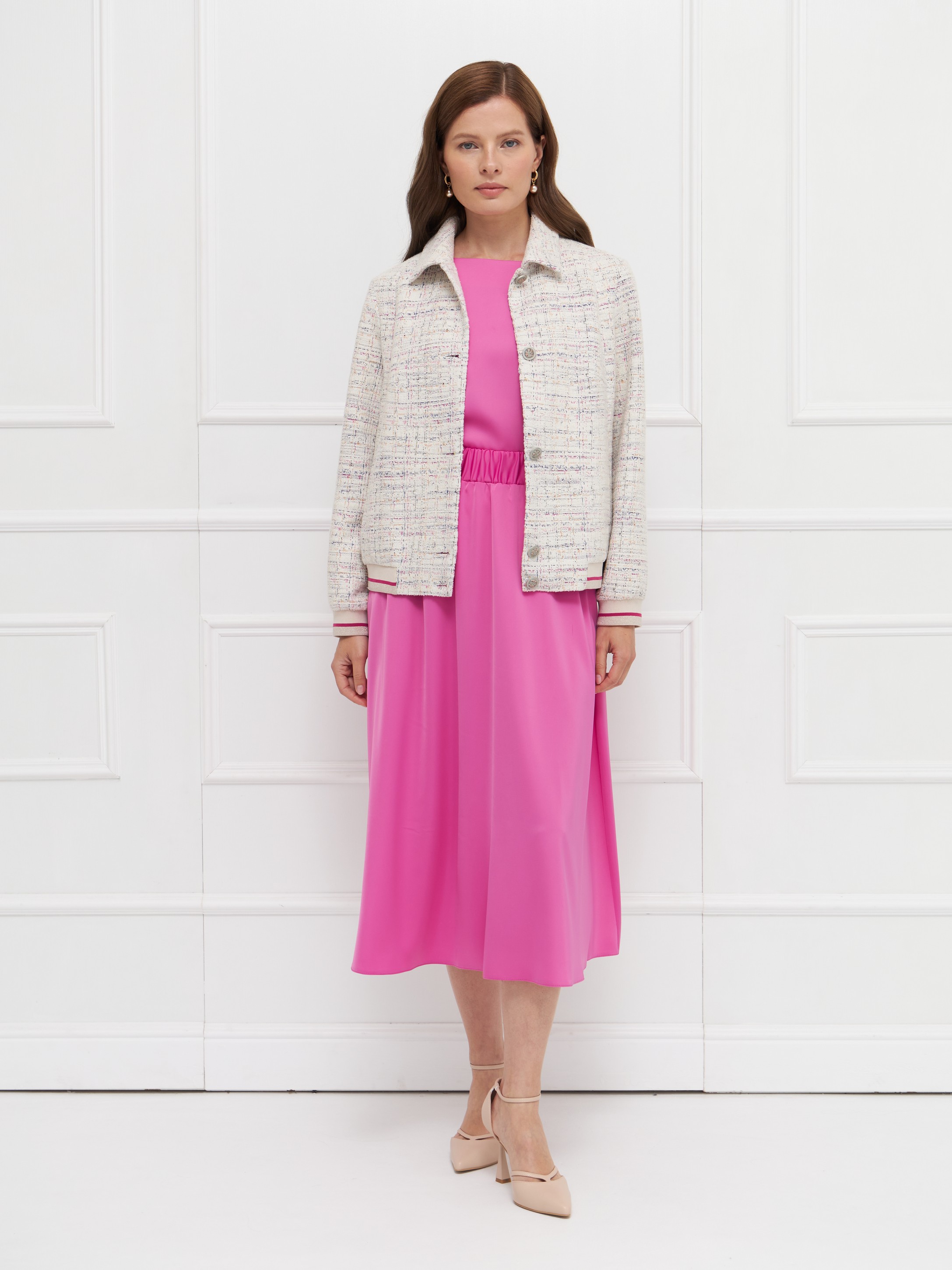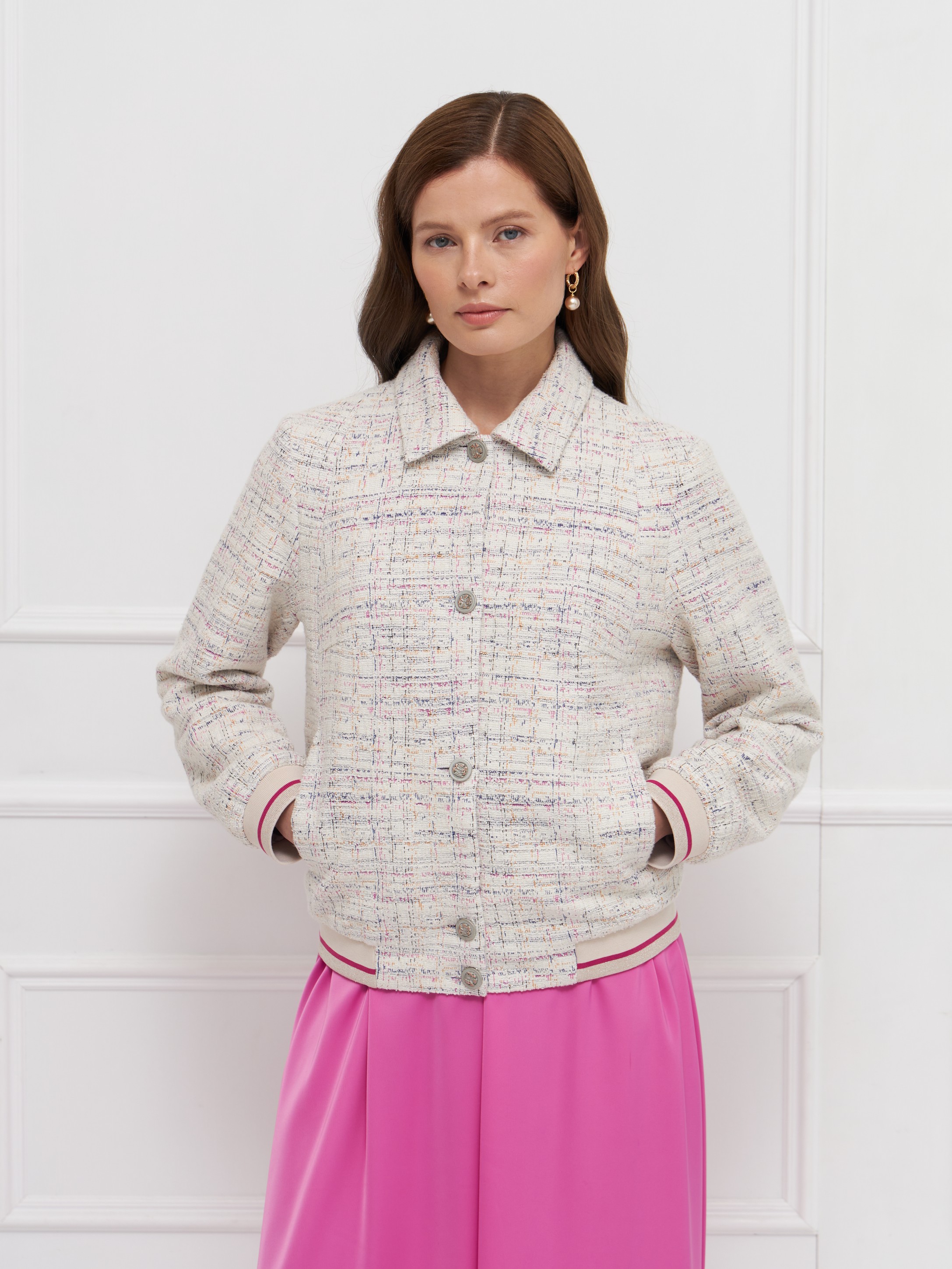 Жакет сочетает элементы классического стиля и спортшика. Прямой силуэт и аккуратный воротник придают модели строгий, собранный вид. Отделка трикотажными подвязами по низу изделия и рукавов добавляет динамики и делает образ менее формальным. Карманы скрыты в рельефных швах, сохраняя чистоту линий. Застежка на декоративные пуговицы выступает выразительным акцентом. Жакет выполнен из плотного трикотажа с твидовой структурой — материал держит форму и комфортен в носке. Модель на подкладке, что обеспечивает дополнительную посадку и практичность. На фото в паре Блузка Д-217 ИОН(О5) и Юбка А-2019 ИОН(О5).