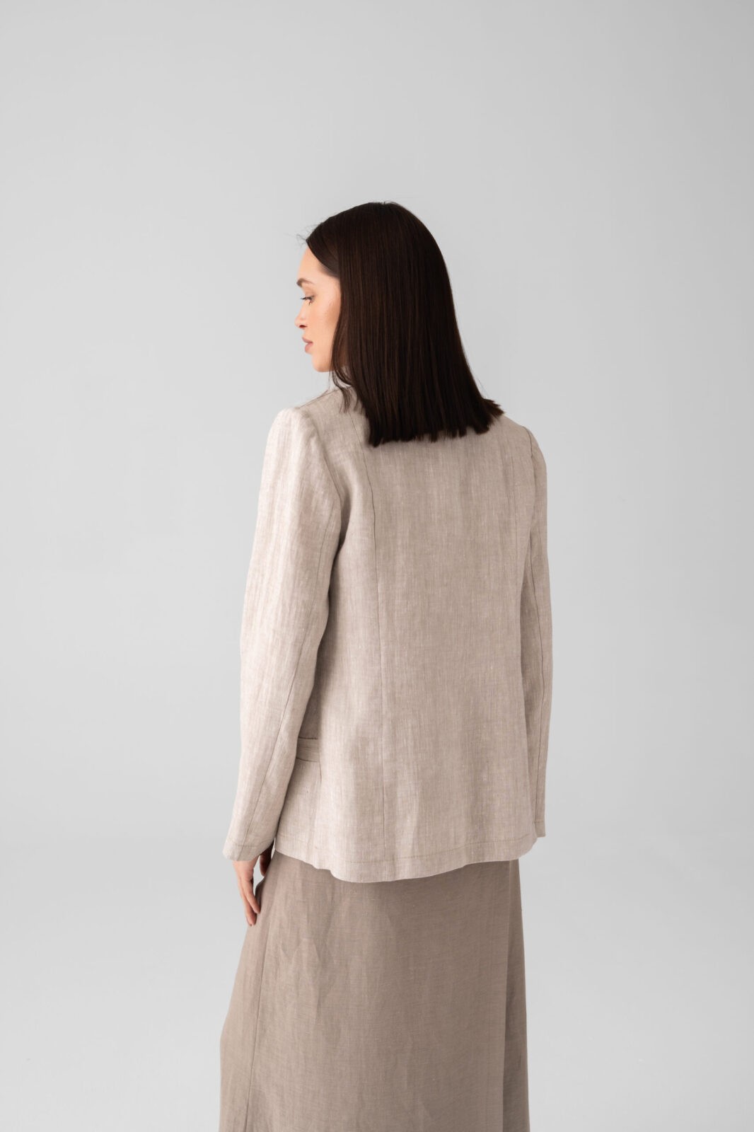 Жакет женский полуприлегающего силуэта, среднего объёма. Прилегание образуется за счёт рельефов  по спинке и вытачек по полочке. Рукав втачной двухшовный. Воротник «английский» пиджачного типа. Застёжка центральная на одну пуговицу. Карманы прорезные с втачной листочкой.