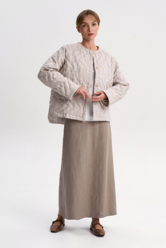 Короткий жакет утепленный стеганный на синтепоне с подкладкой. Спущенный рукав. Застежка центральная на пуговицы и навесные петли. Горловина округлой формы. Низ фигурный с разрезами по бокам.