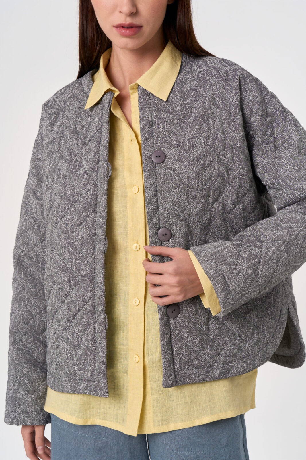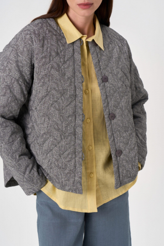 Короткий жакет утепленный стеганный на синтепоне с подкладкой. Спущенный рукав. Застежка центральная на пуговицы и навесные петли. Горловина округлой формы. Низ фигурный с разрезами по бокам.