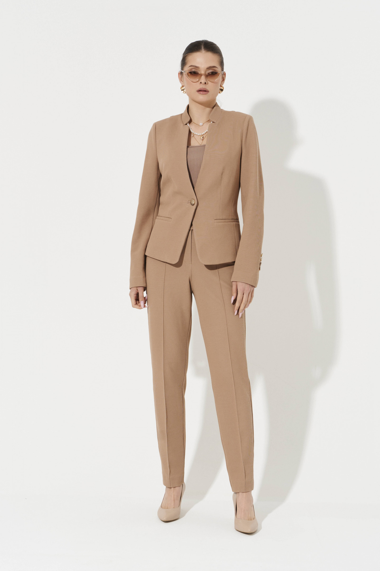 Жакет женский из смесового трикотажного полотна с добавлением хлопка. Жакет полуприлегающего силуэта. Застежка центральная бортовая на одну обметанную петлю и одну пуговицу. Перед имеет две талиевые вытачки и рельефы, идущие от проймы до линии низа изделия, а также на переде располагается два прорезных кармана с листочкой. Спинка со средним швом и четырьмя рельефами. Рельефы, идущие от плечевого шва и от проймы до низа изделия. Горловина V-образная, обработана воротником стойкой. Рукава втачные длинные. По низу рукава имеется декоративная шлица на обметанные петли и пуговицы. Жакет имеет поливискозную подкладку по переду, что очень удобно.Очень стильный и удобный жакет, который обязательно не оставит никого равнодушным. Жакет для повседневной носки.