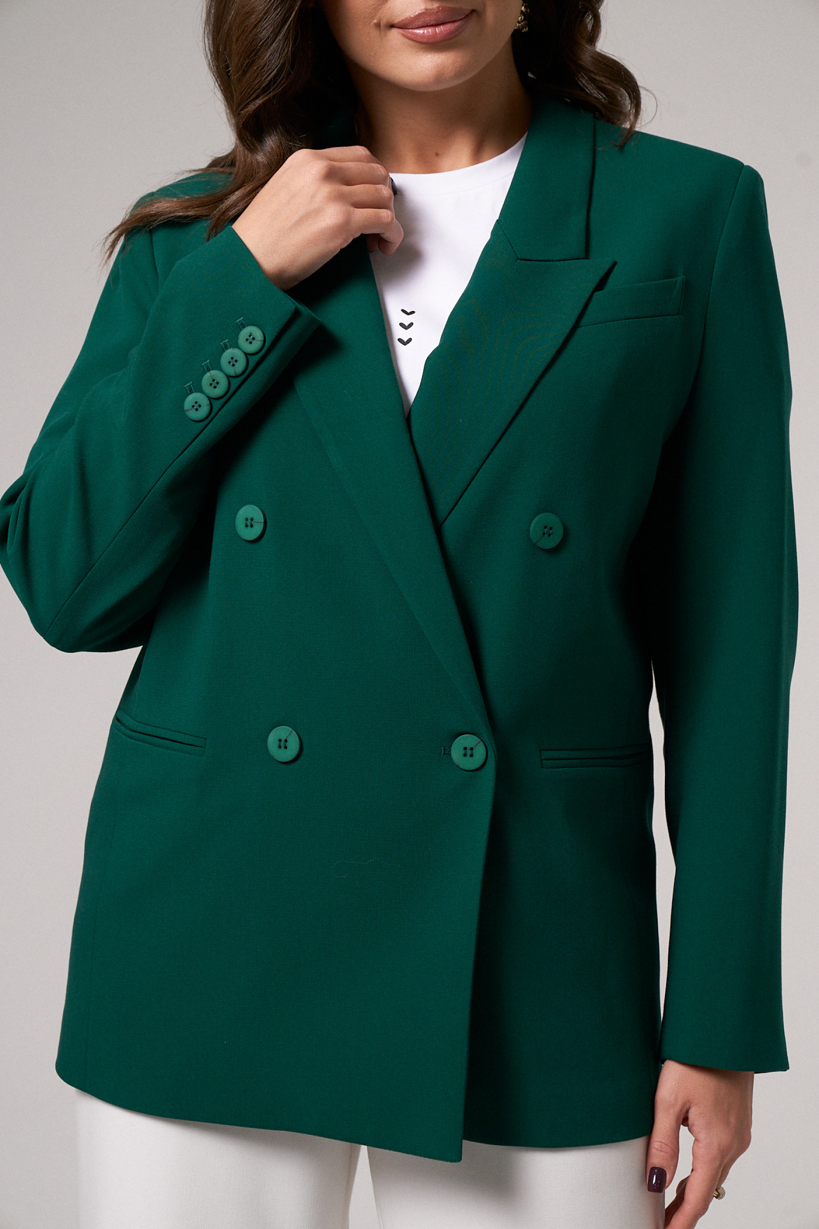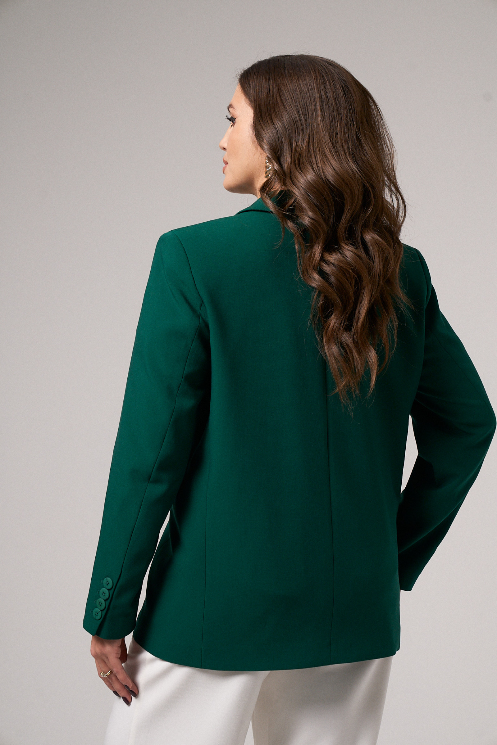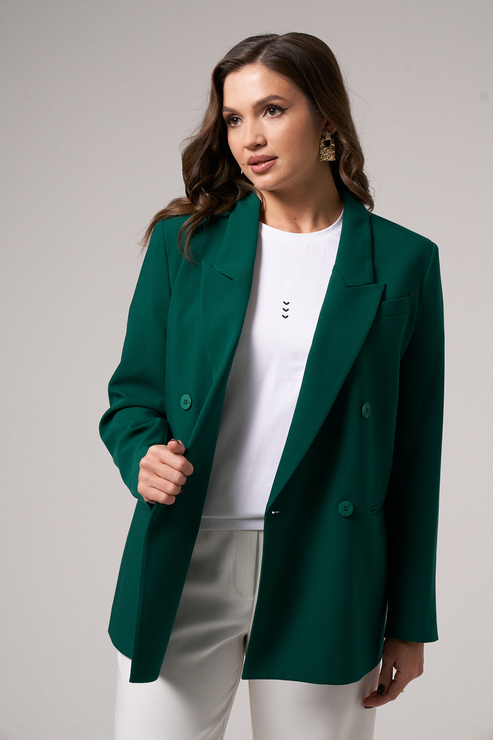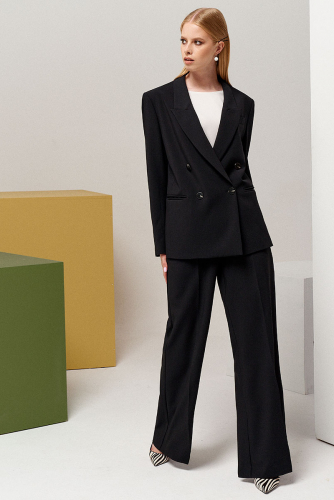 Удлиненный жакет прекрасно дополнит брюки в деловом стиле, уже имеющиеся в вашем арсенале модной одежды. Жакет женский оверсайз имеет достаточно свободный крой, не подразумевает посадку по фигуре. Вы можете носить деловой жакет как самодостаточный элемент, поддевая под низ нижнее белье, топ, однотонную футболку, майку. Двубортный жакет женский – отличный вариант. Поэтому он хорошо смотрится с узкими и широкими штанами. Выполнен жакет из трикотажа, хорошо держит форму. Вы можете купить черный классический пиджак по выгодной цене в размерах 42-50.