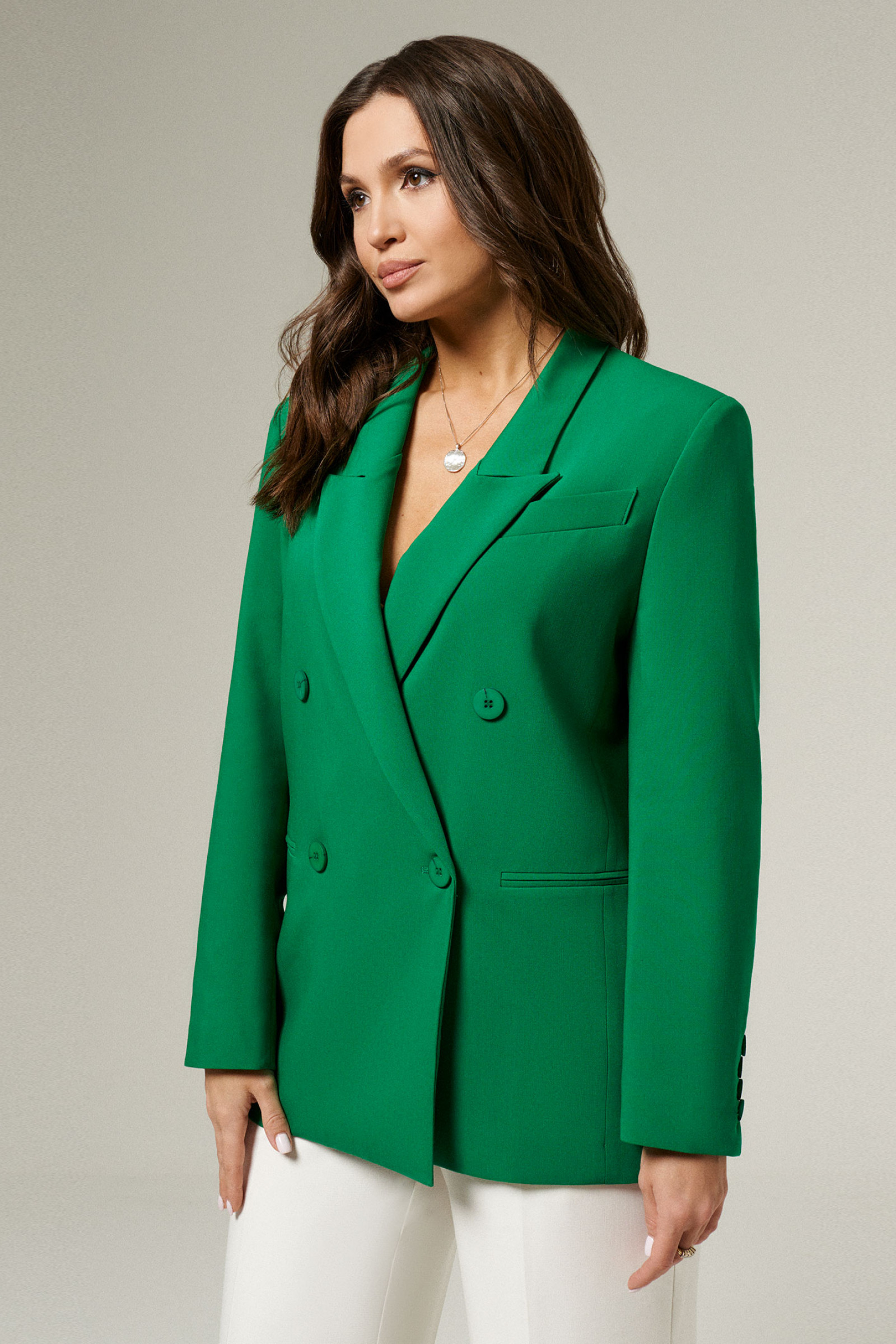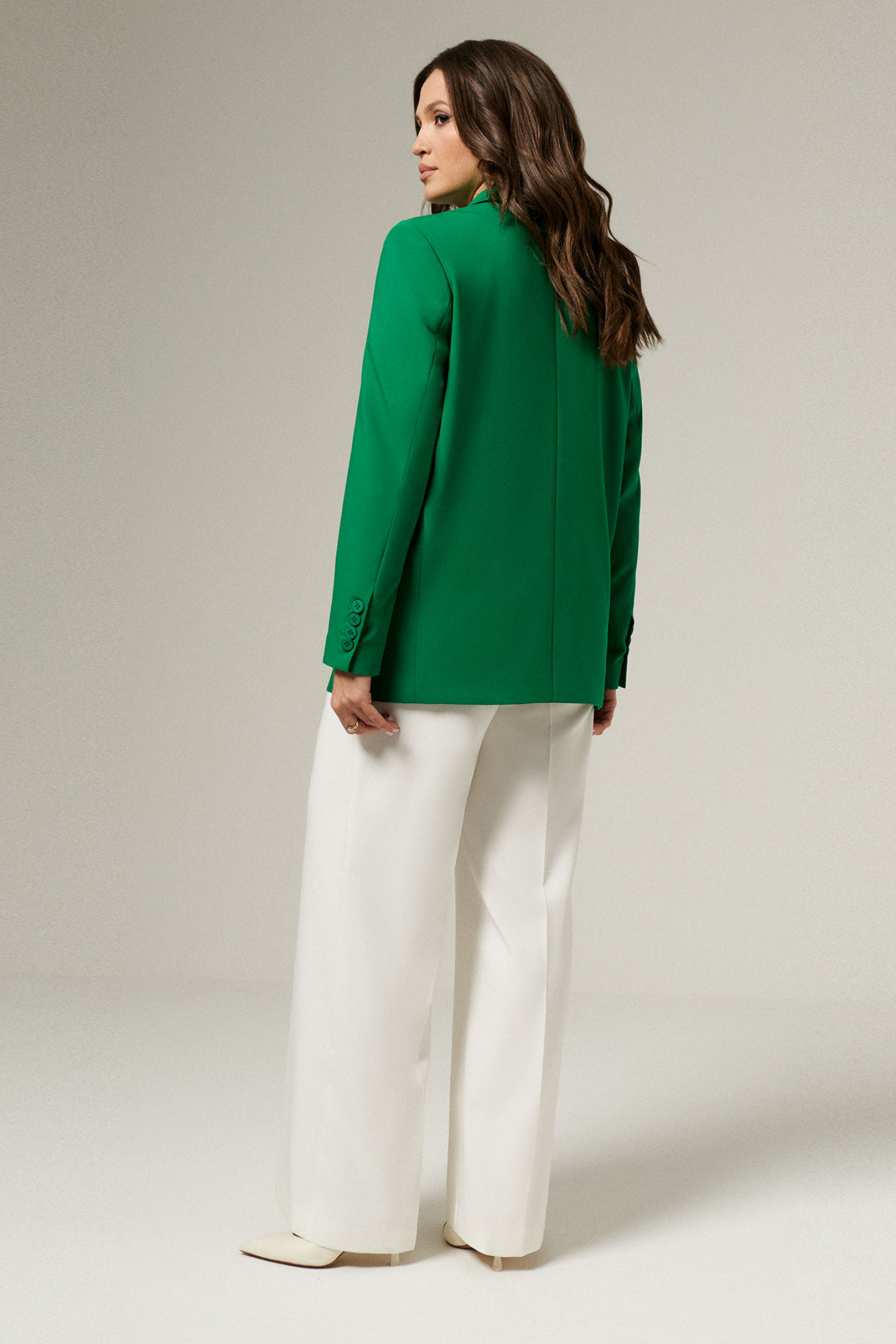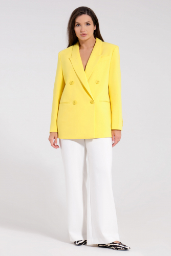 Удлиненный жакет прекрасно дополнит брюки в деловом стиле, уже имеющиеся в вашем арсенале модной одежды. Жакет женский оверсайз имеет достаточно свободный крой, не подразумевает посадку по фигуре. Вы можете носить деловой жакет как самодостаточный элемент, поддевая под низ нижнее белье, топ, однотонную футболку, майку. Двубортный жакет женский – отличный вариант. Поэтому он хорошо смотрится с узкими и широкими штанами. Выполнен жакет из трикотажа, хорошо держит форму. Вы можете купить черный классический пиджак по выгодной цене в размерах 42-50.