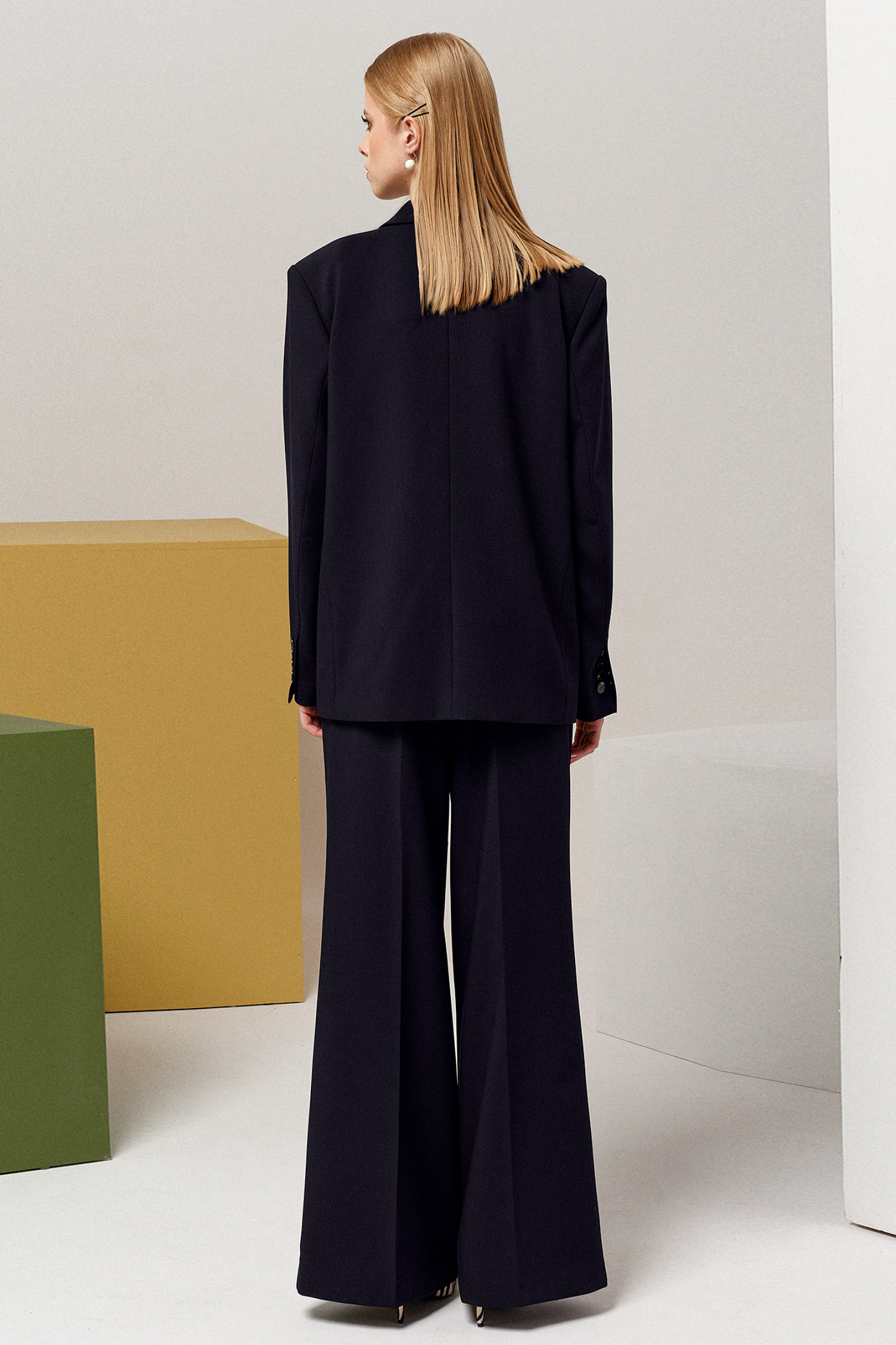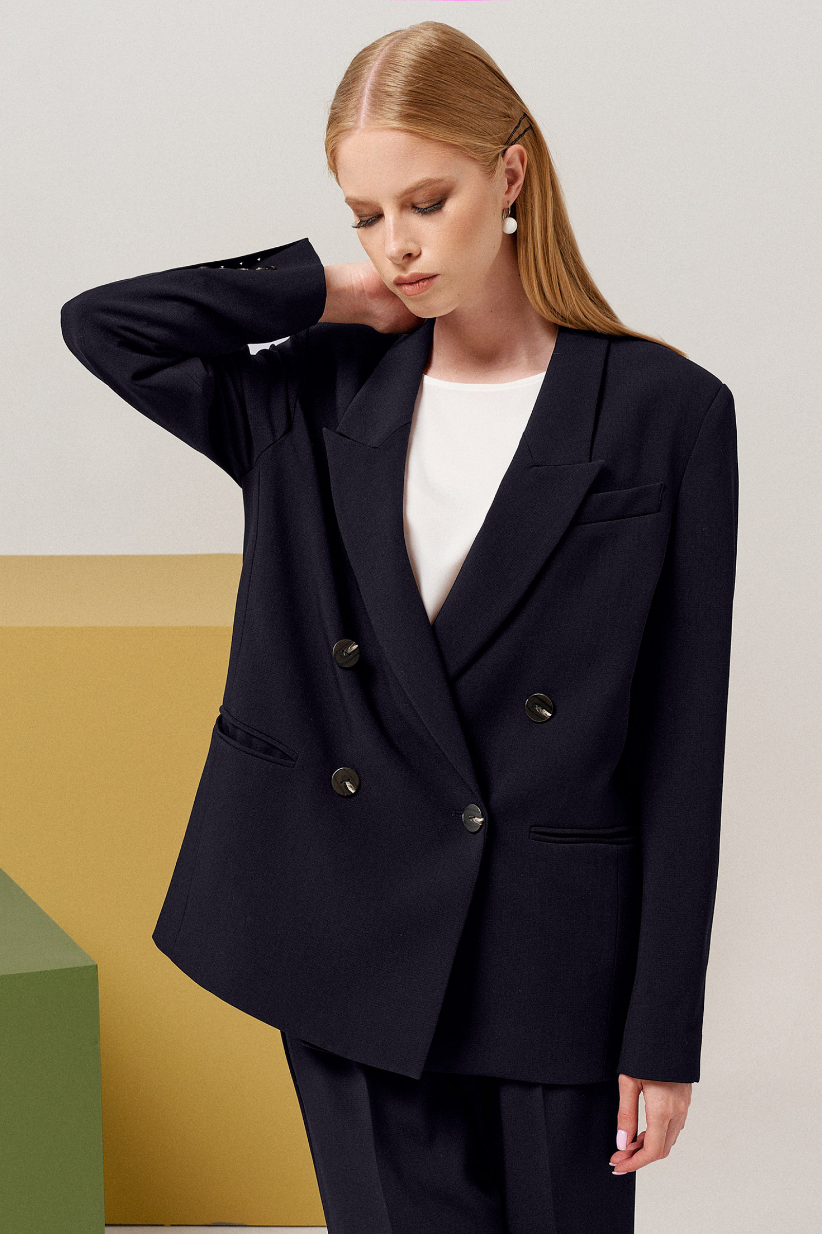 Удлиненный жакет прекрасно дополнит брюки в деловом стиле, уже имеющиеся в вашем арсенале модной одежды. Жакет женский оверсайз имеет достаточно свободный крой, не подразумевает посадку по фигуре. Вы можете носить деловой жакет как самодостаточный элемент, поддевая под низ нижнее белье, топ, однотонную футболку, майку. Двубортный жакет женский – отличный вариант. Поэтому он хорошо смотрится с узкими и широкими штанами. Выполнен жакет из трикотажа, хорошо держит форму. Вы можете купить черный классический пиджак по выгодной цене в размерах 42-50.