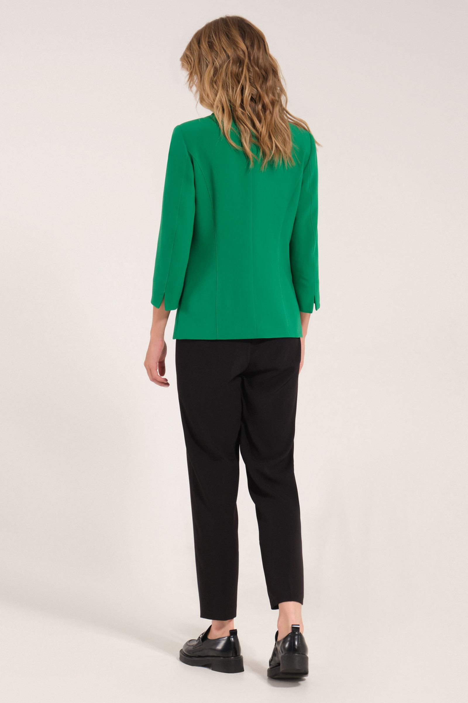 Жакет на пуговице поможет вам выглядеть эффектно и элегантно в любой ситуации. Его уместно надеть на работу, в гости, на деловую и дружескую встречу, деловое мероприятие. Модель составляет гармоничные сеты с брюками, джинсами, юбками. Классический, слегка приталенный крой, хорошо подчеркнет женственность вашей фигуры. Жакет с двубортным воротником привлекает внимание глубоким V-вырезом горловины, длиной рукава – 3/4. Осенний жакет полуприлегающего силуэта пошит с прорезными карманами и комфортной подкладкой. Приняв решения купить пиджак женский, вы обеспечите себе тепло и комфорт в прохладную погоду межсезонья.