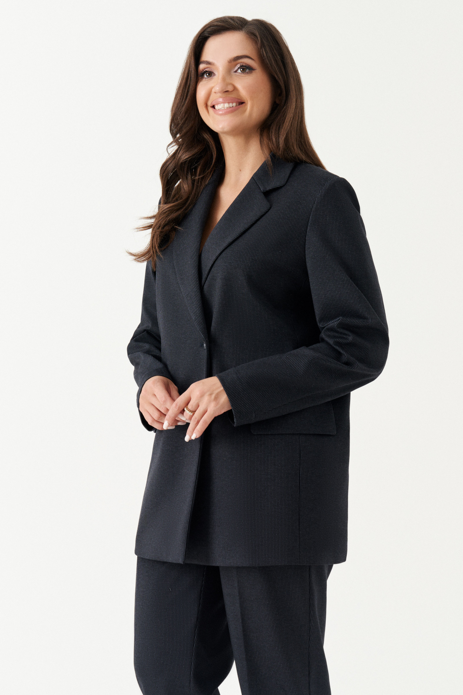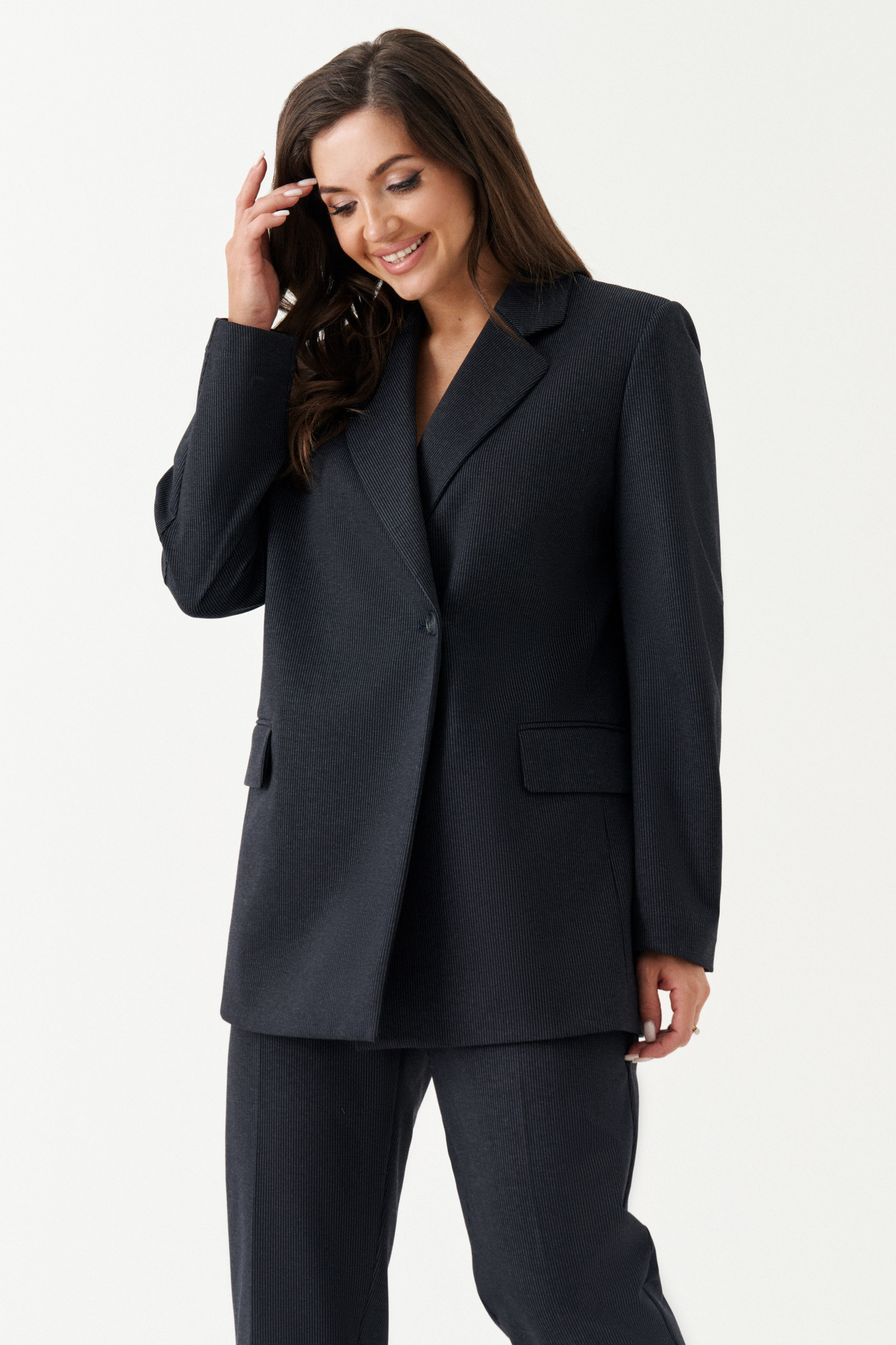 Жакет женский из трикотажного полотна. Жакет полуприлегающего силуэта для повседневной носки на подкладке. Перед имеет два рельефа выходящих из проймы и доходящих до линии низа. Спинка имеет два рельефа выходящих из проймы и доходящих до линии низа. Горловина обработана пиджачным воротником. Рукава двухшовные. В качестве прилегания в области талии имеется пояс. Отличный жакет в офис и на работу.