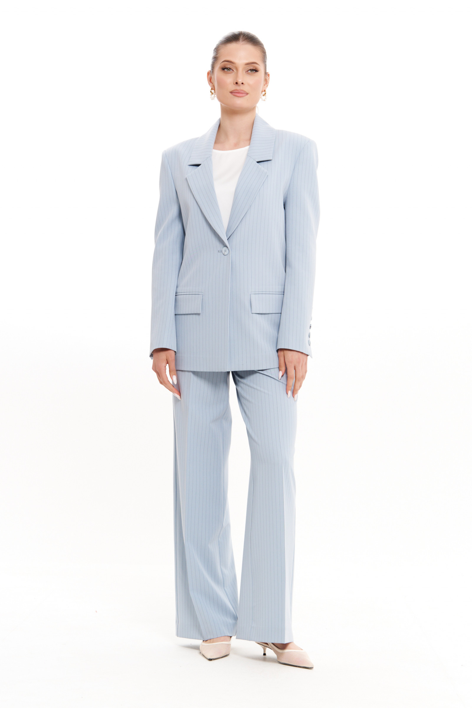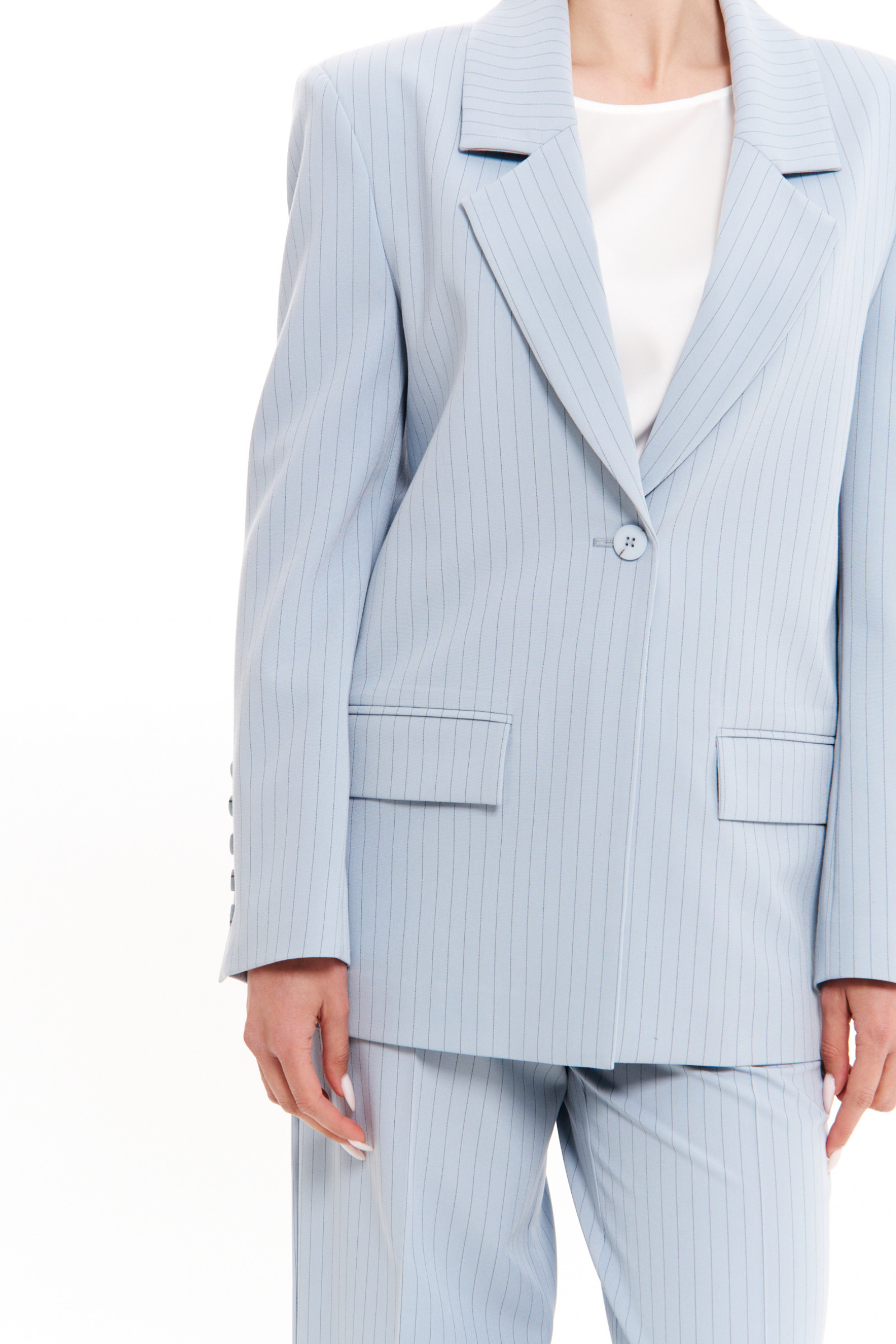 Жакет выполнен в нежном голубом оттенке, что делает его идеальным для летнего и весеннего сезонов. Модель дополнена прорезным карманом с клапаном, двухшовными рукавами с нарядной шлицей и пуговицами. Подкладка обеспечивает удобство при носке, а классический крой подходит для любого типа фигуры.