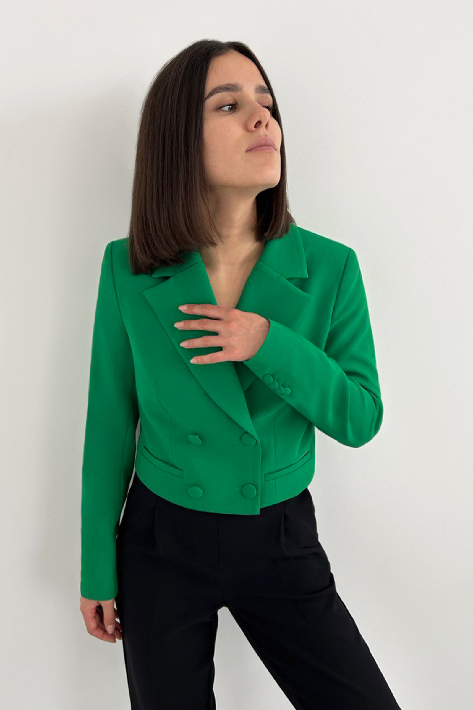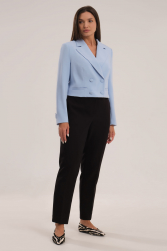 Двубортный жакет женский на пуговицах, обшитых в цвет ткани, оформлен боковыми декоративными рамками. Они имитируют форму нагрудных карманов с листочкой. Длинные втачные рукава со шлицей и пуговицей.