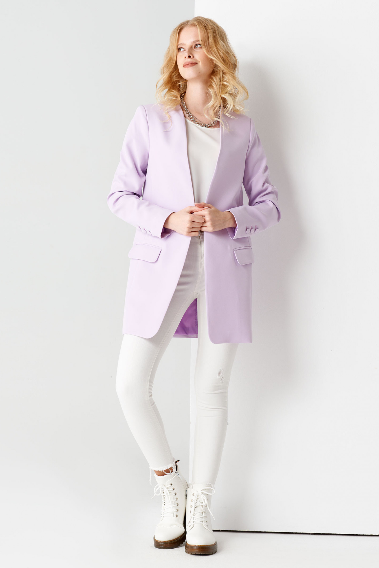 Стильный модный жакет. Это повседневный удобный и практичный жакет, который отлично сочетается как с джинсами, так и с брюками. Жакет удлиненный, без застежки, рукава длинные. По переду имеются карманы с клапаном. Жакет на подкладки.